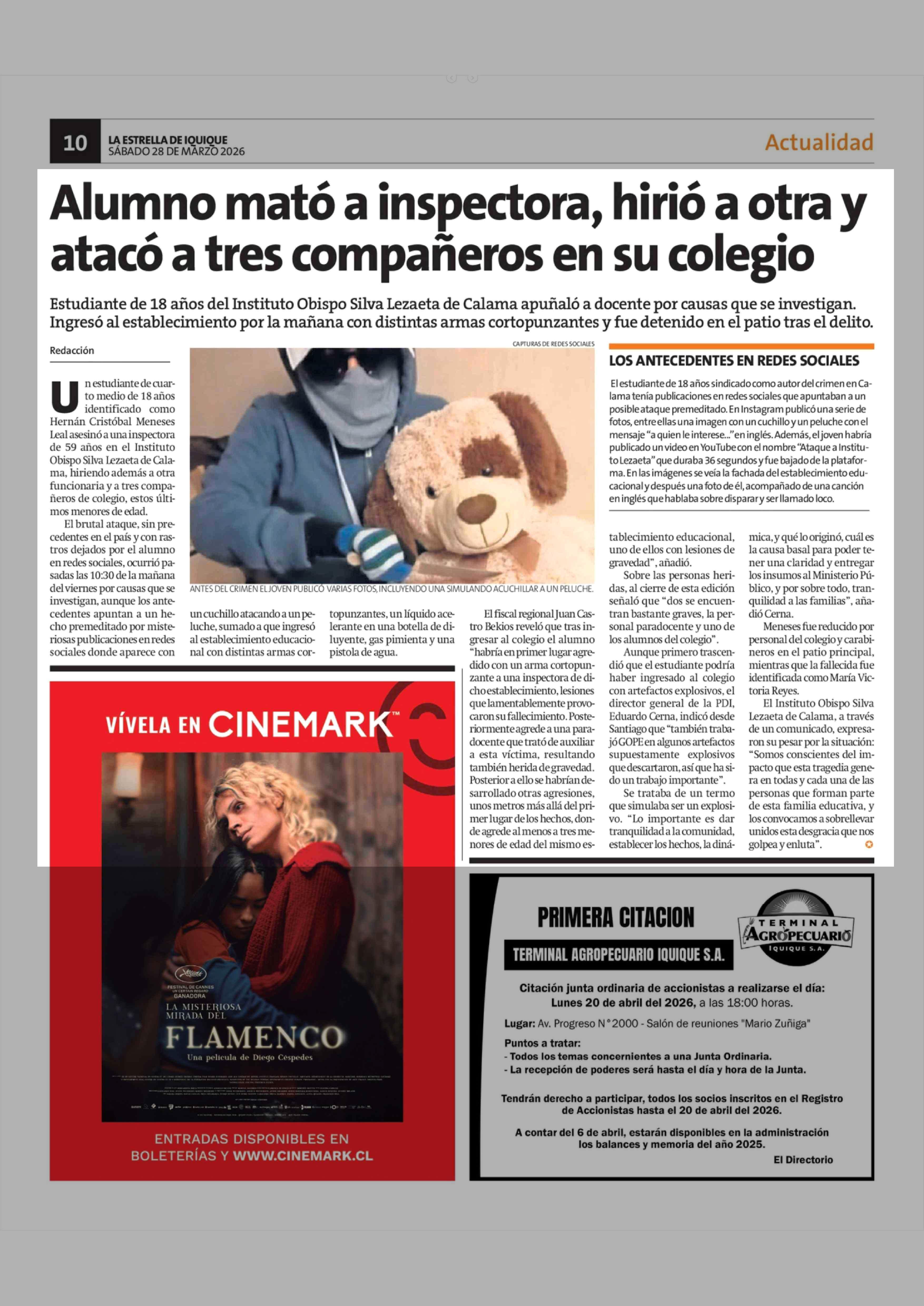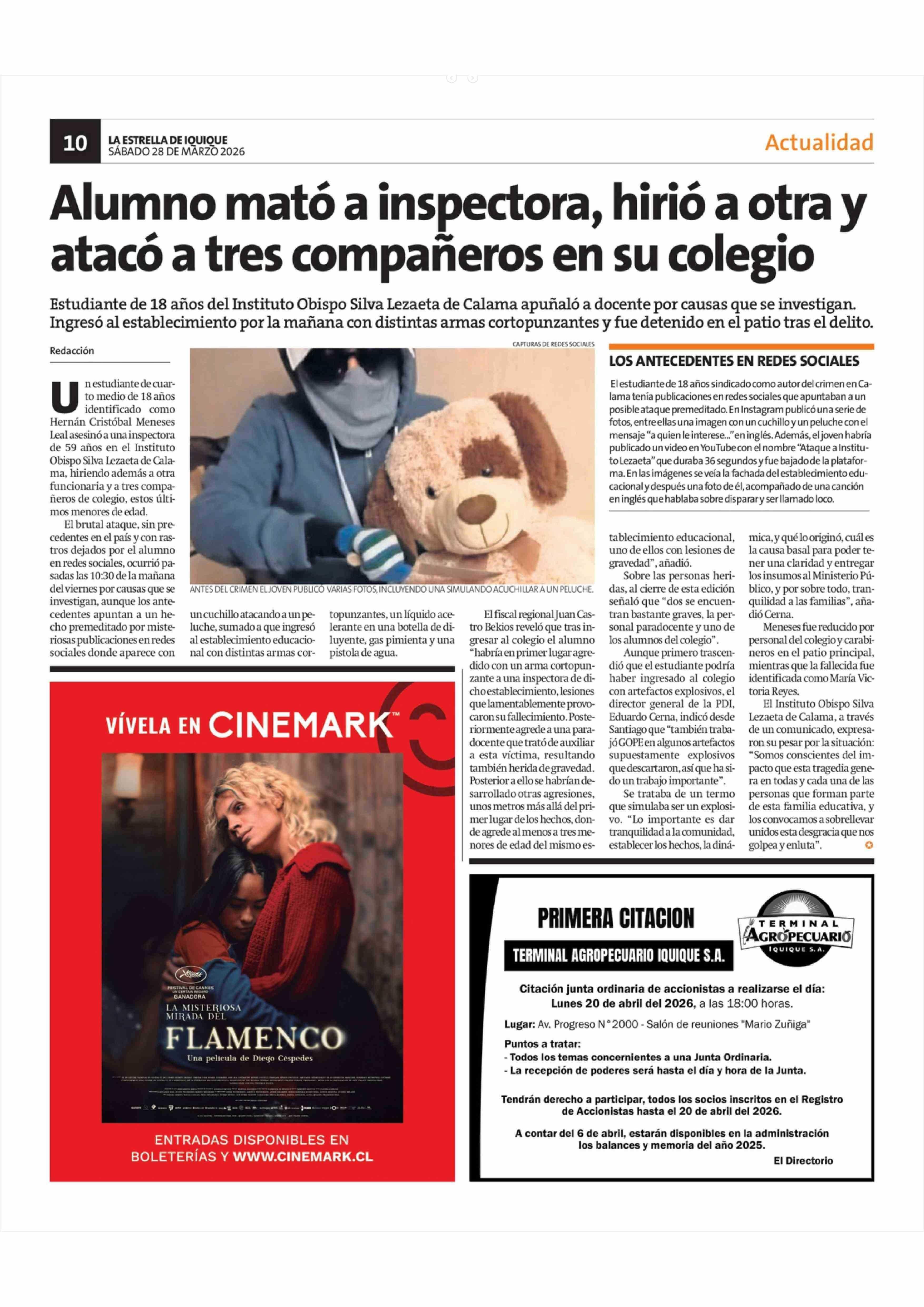 Alumno mató a inspectora, hirió a otra y atacó a tres compañeros en su colegio 28-03-2026 La Estrella de Iquique |