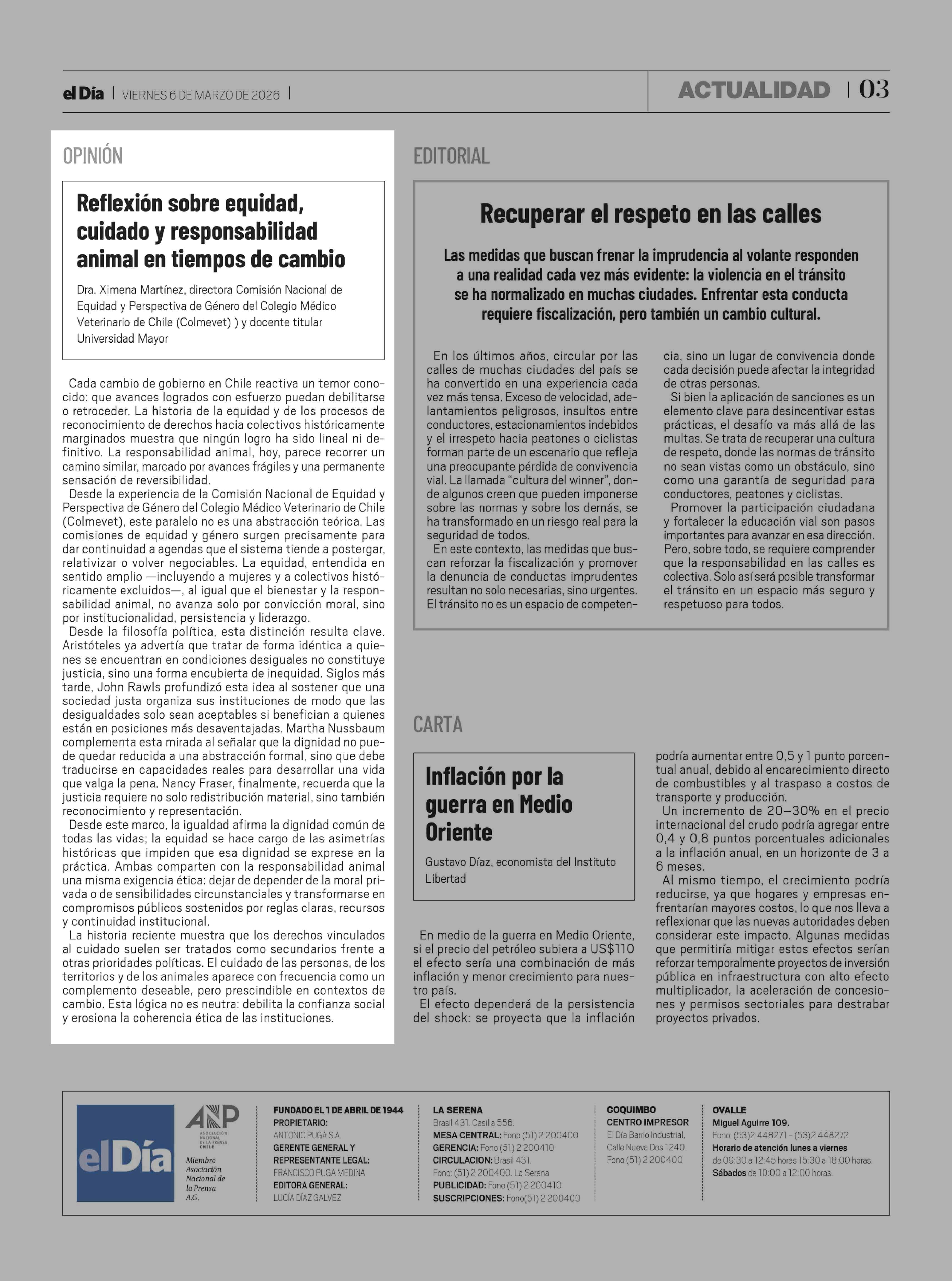 Columnas de Opinión: Reflexión sobre equidad, cuidado y responsabilidad animal en tiempos de cambio 06-03-2026 El Día |