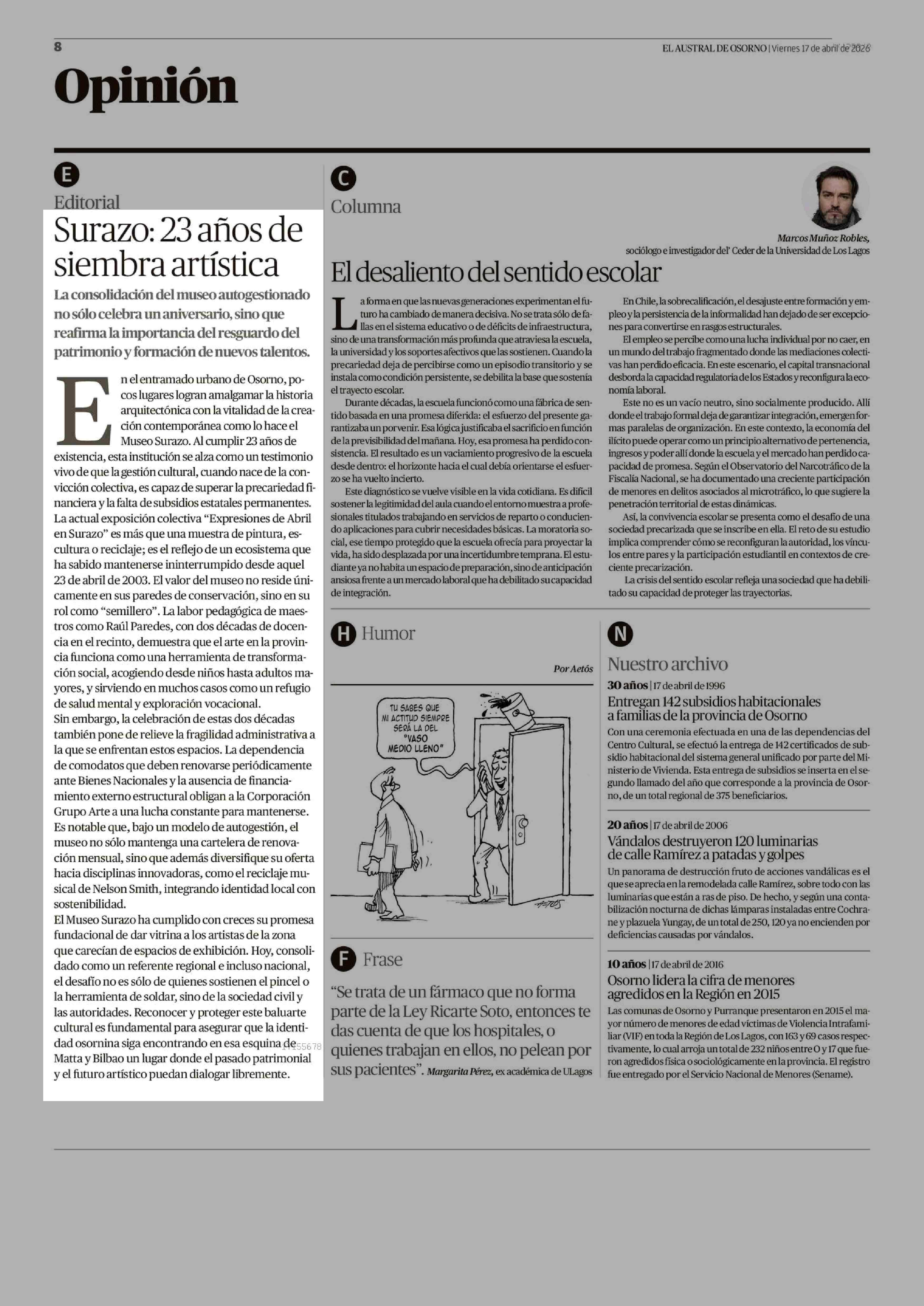 EDITORIAL: 23 años de siembra artística 17-04-2026 El Austral de Osorno |