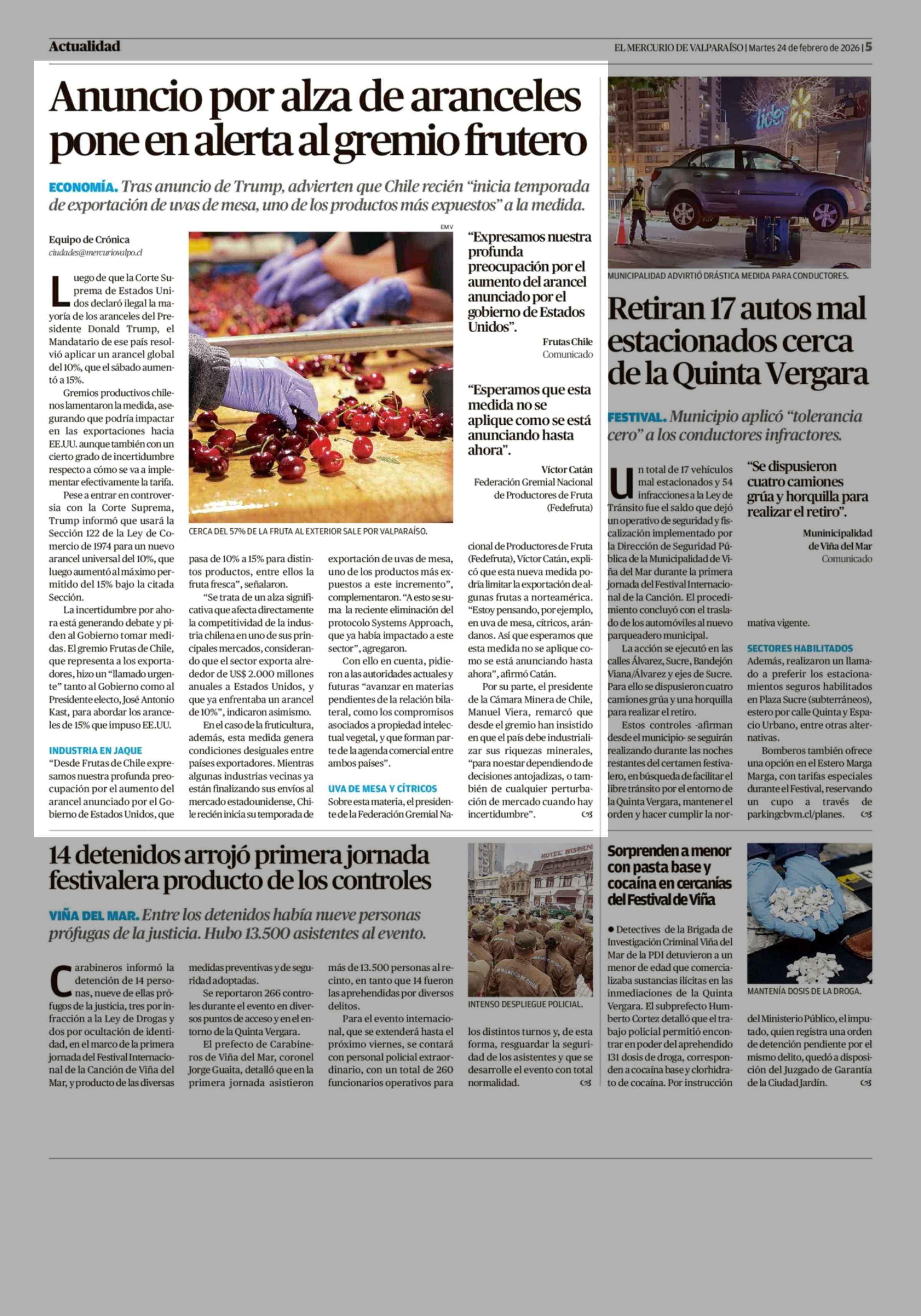 Anuncio por alza de aranceles pone en alerta al gremio frutero 24-02-2026 El Mercurio de Valparaíso |