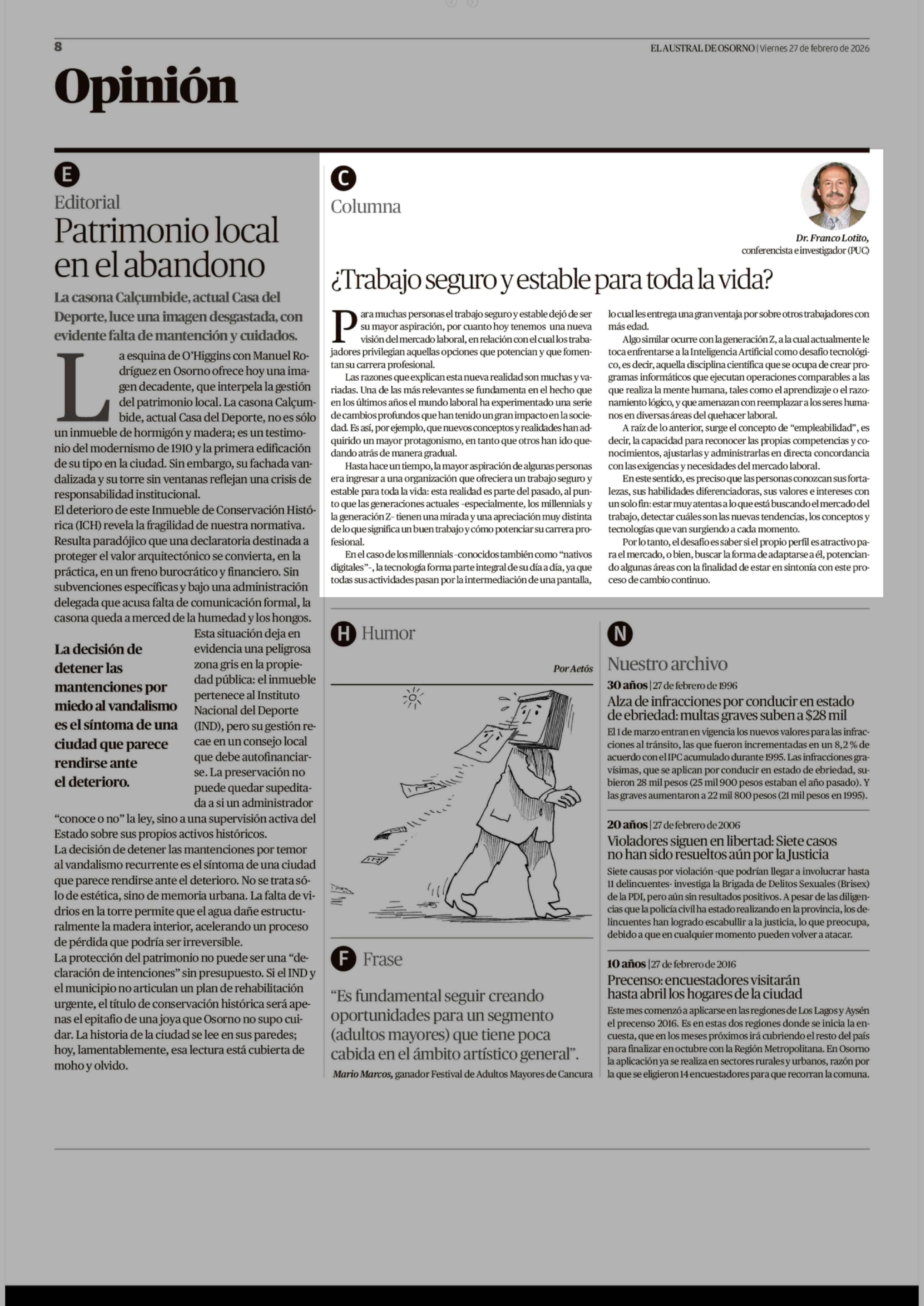 Columnas de Opinión: ¿Trabajo seguro y estable para toda la vida? 27-02-2026 El Austral de Osorno |