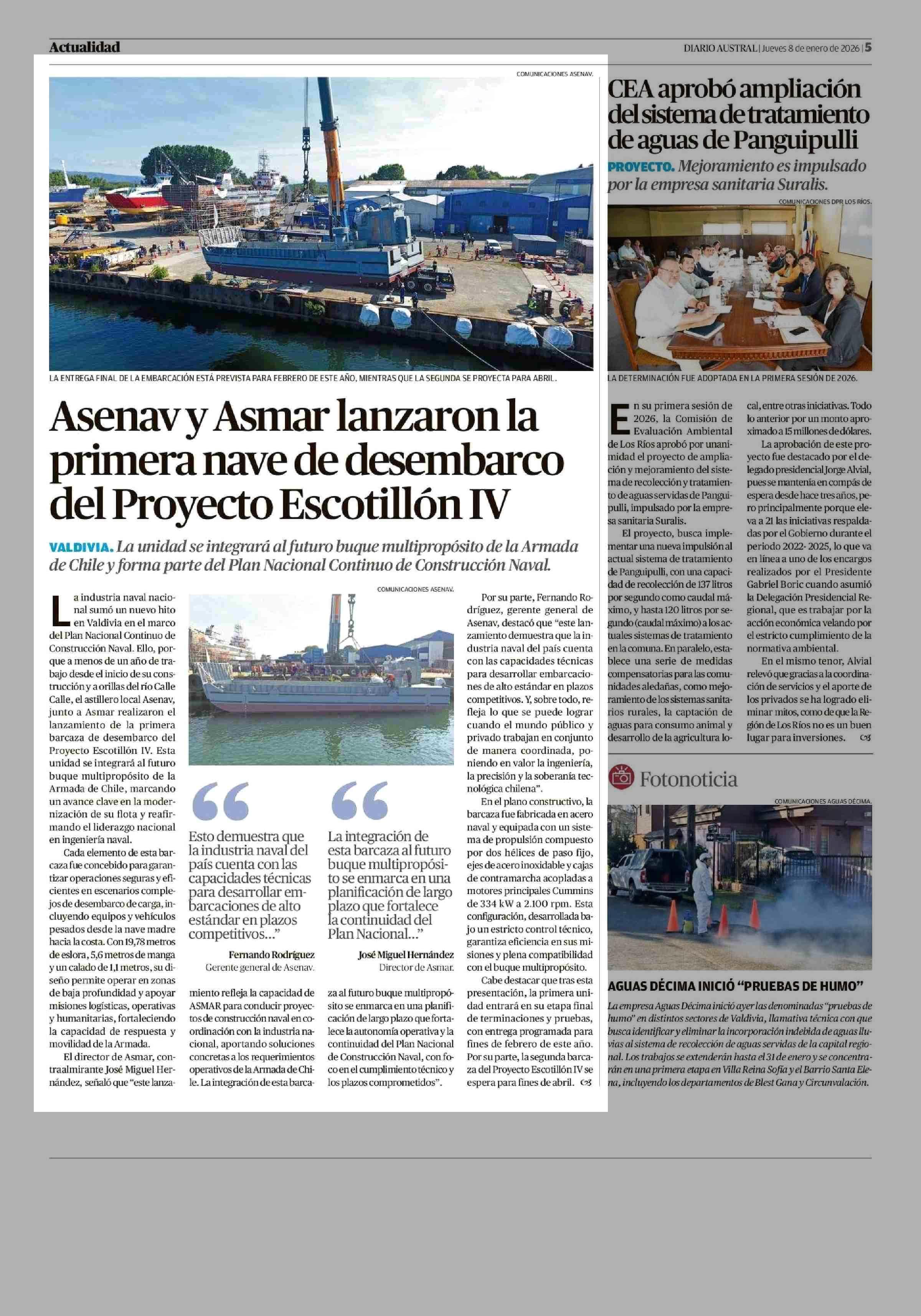 Asenavy Asmar lanzaron la primera nave de desembarco del Proyecto Escotillón IV 08-01-2026 Diario Austral Región de Los Ríos |