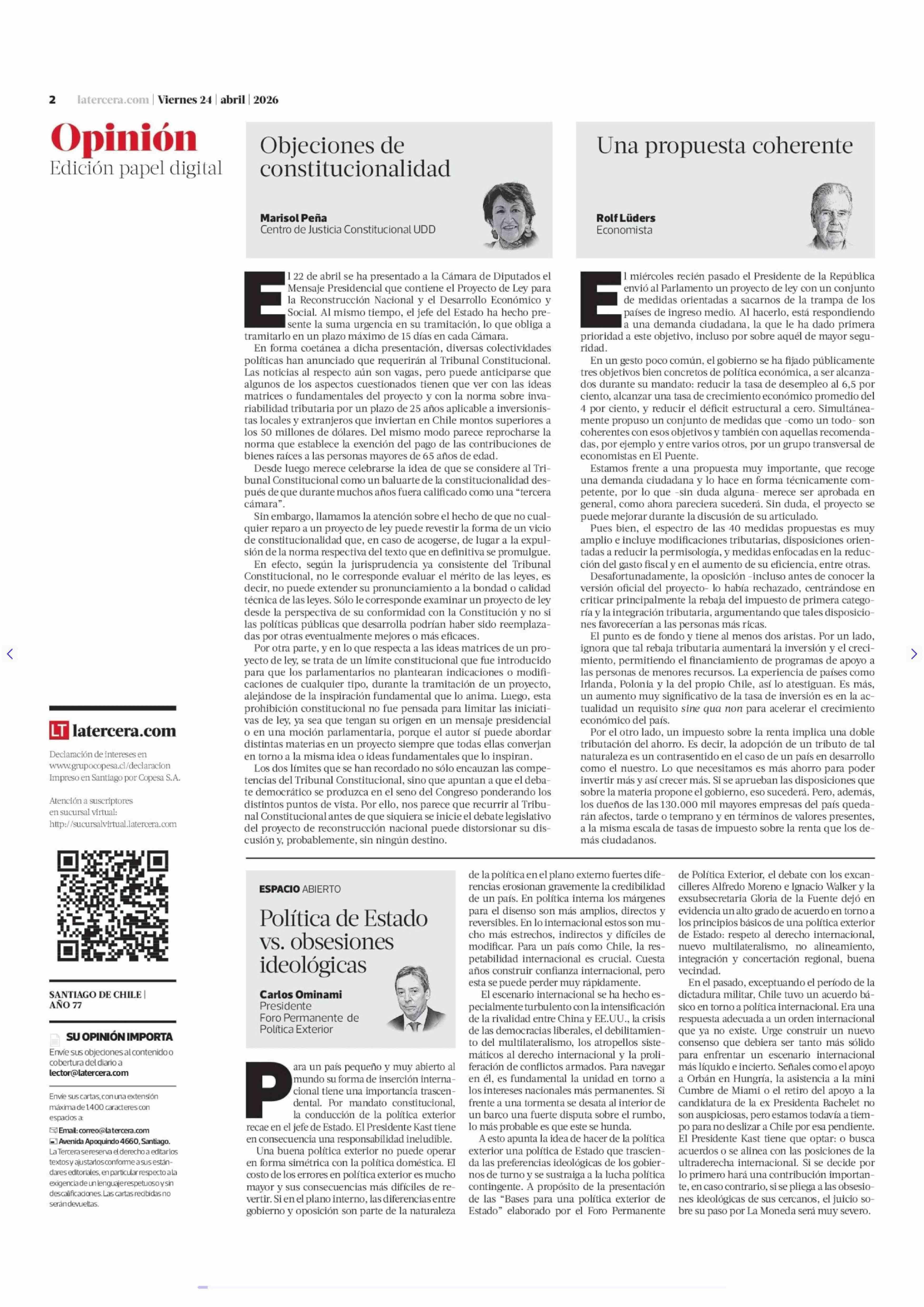 Cartas: Política de Estado vs. obsesiones ideológicas 24-04-2026 La Tercera |