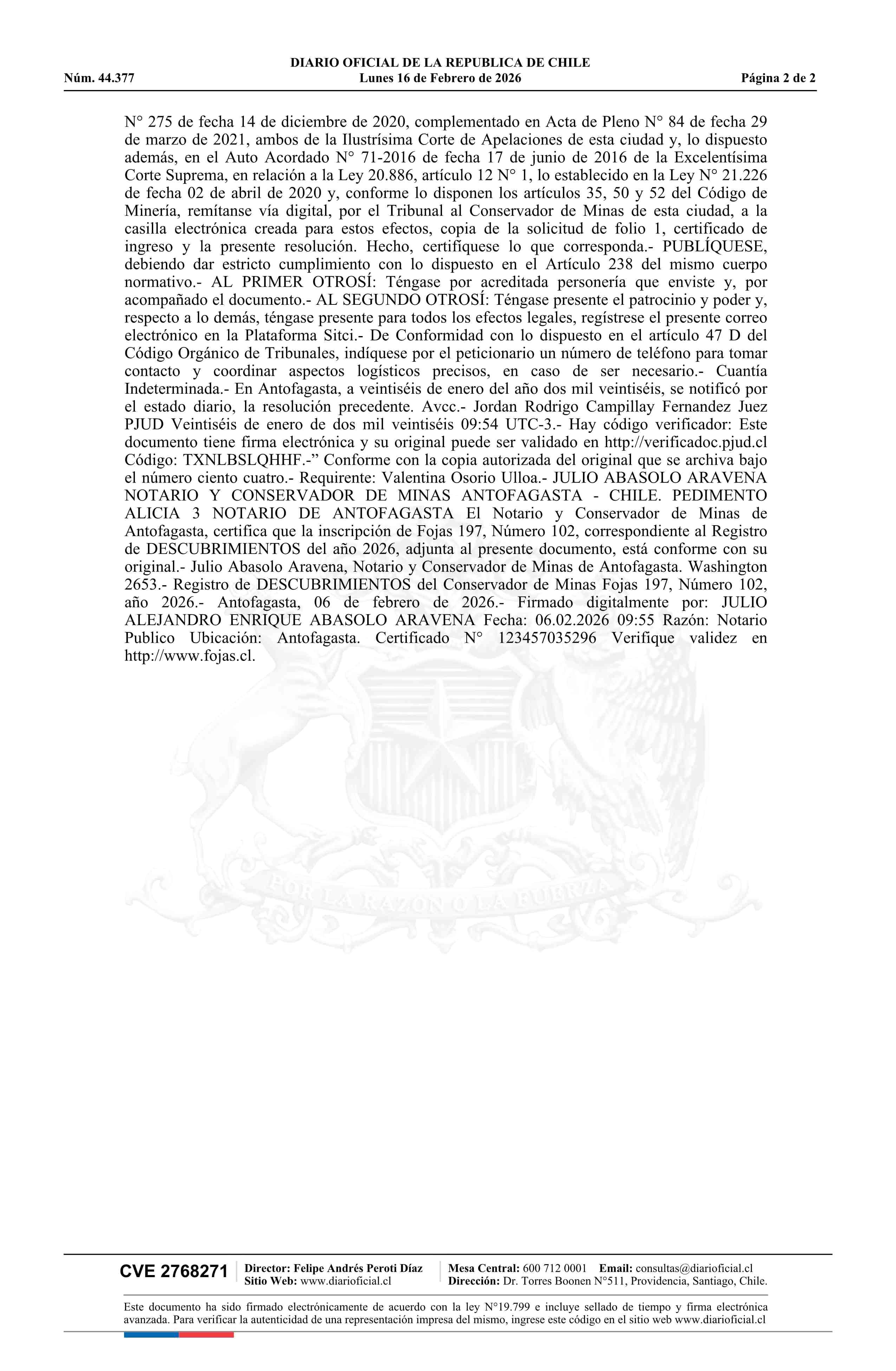 | Fuente: | DIARIO OFICIAL CHILE - BOLETÍN OFICIAL DE MINERÍA (DIARIO OFICIAL CHILE – BOM – PEDIMENTOS MINEROS) | Página(s): | 36-37 |