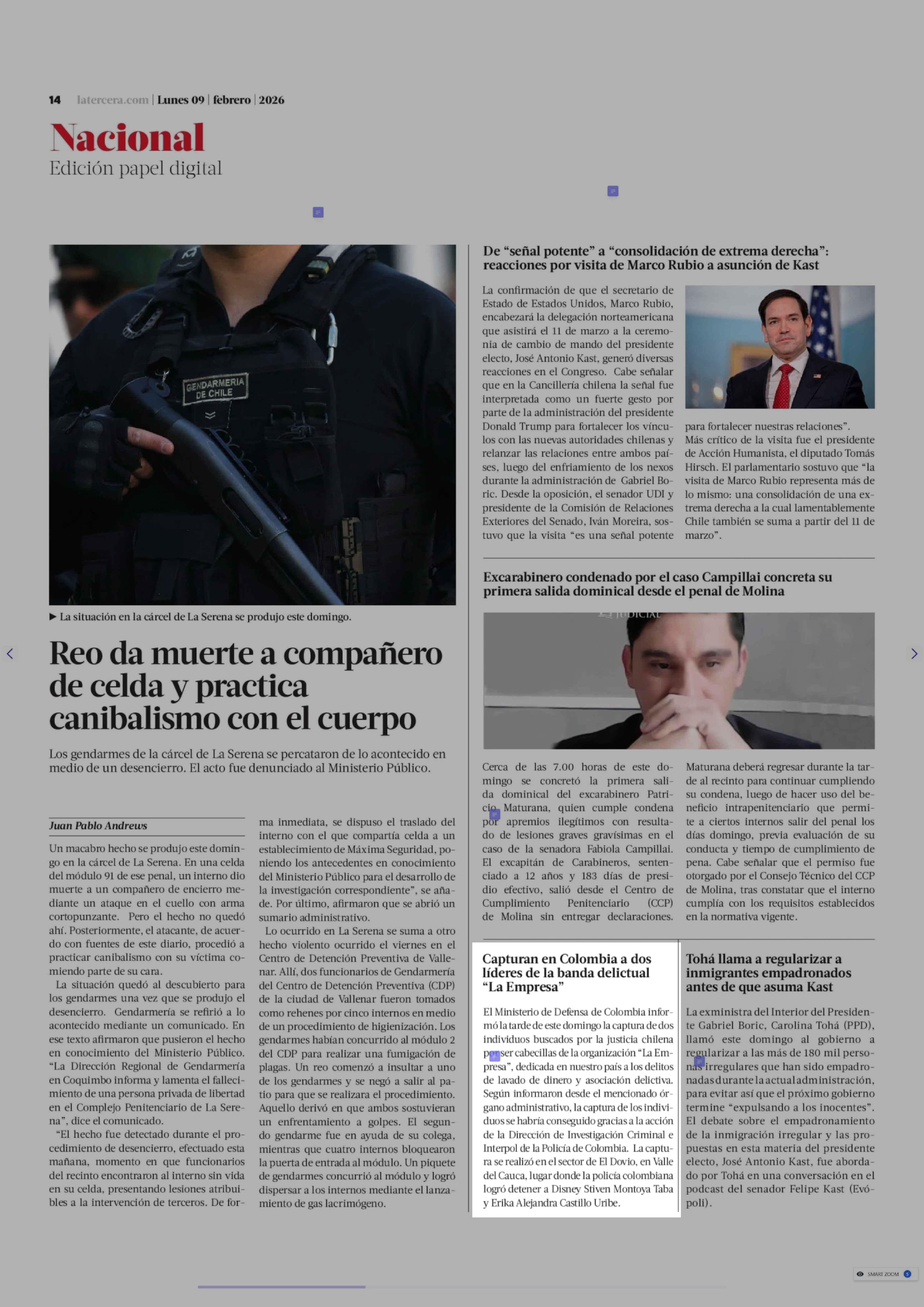 Capturan en Colombia a dos líderes de la banda delictual "La Empresa" 09-02-2026 La Tercera |