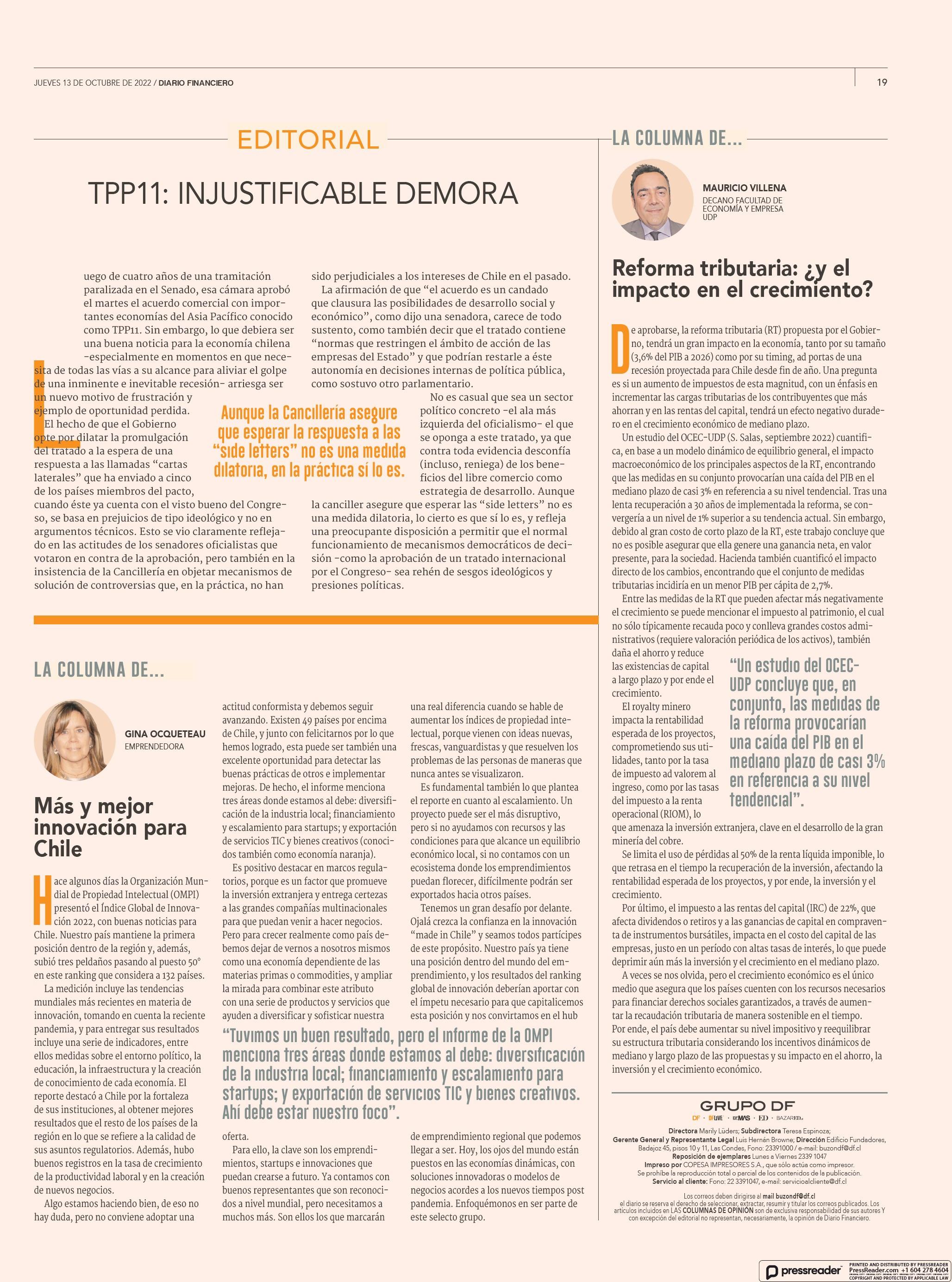 Reforma tributaria: ¿ y el impacto en el crecimiento? 13-10-2022 Diario Financiero |