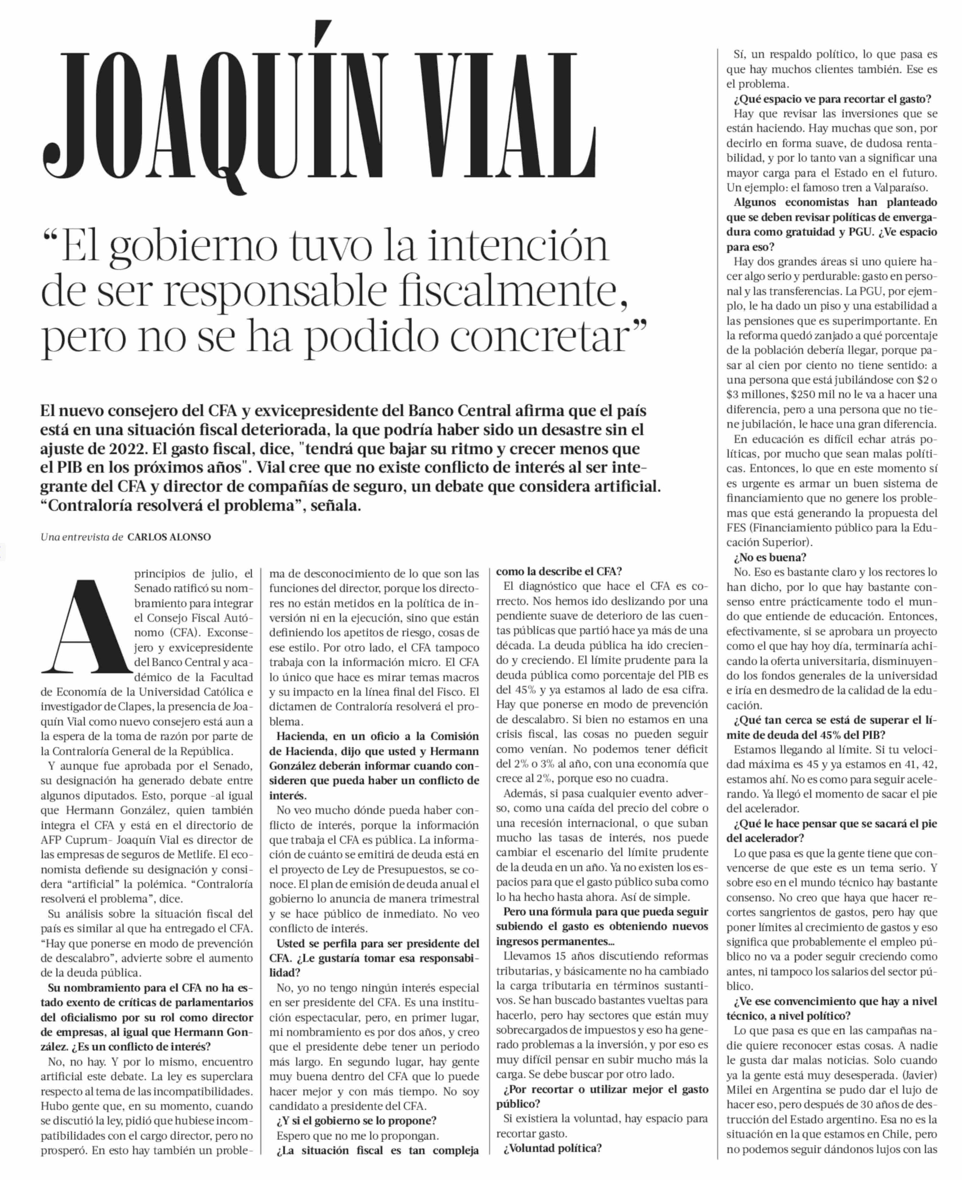 | Título: | JOAQUÍN VIAL “El gobierno tuvo la intención de ser responsable fiscalmente, pero no se ha podido concretar” |