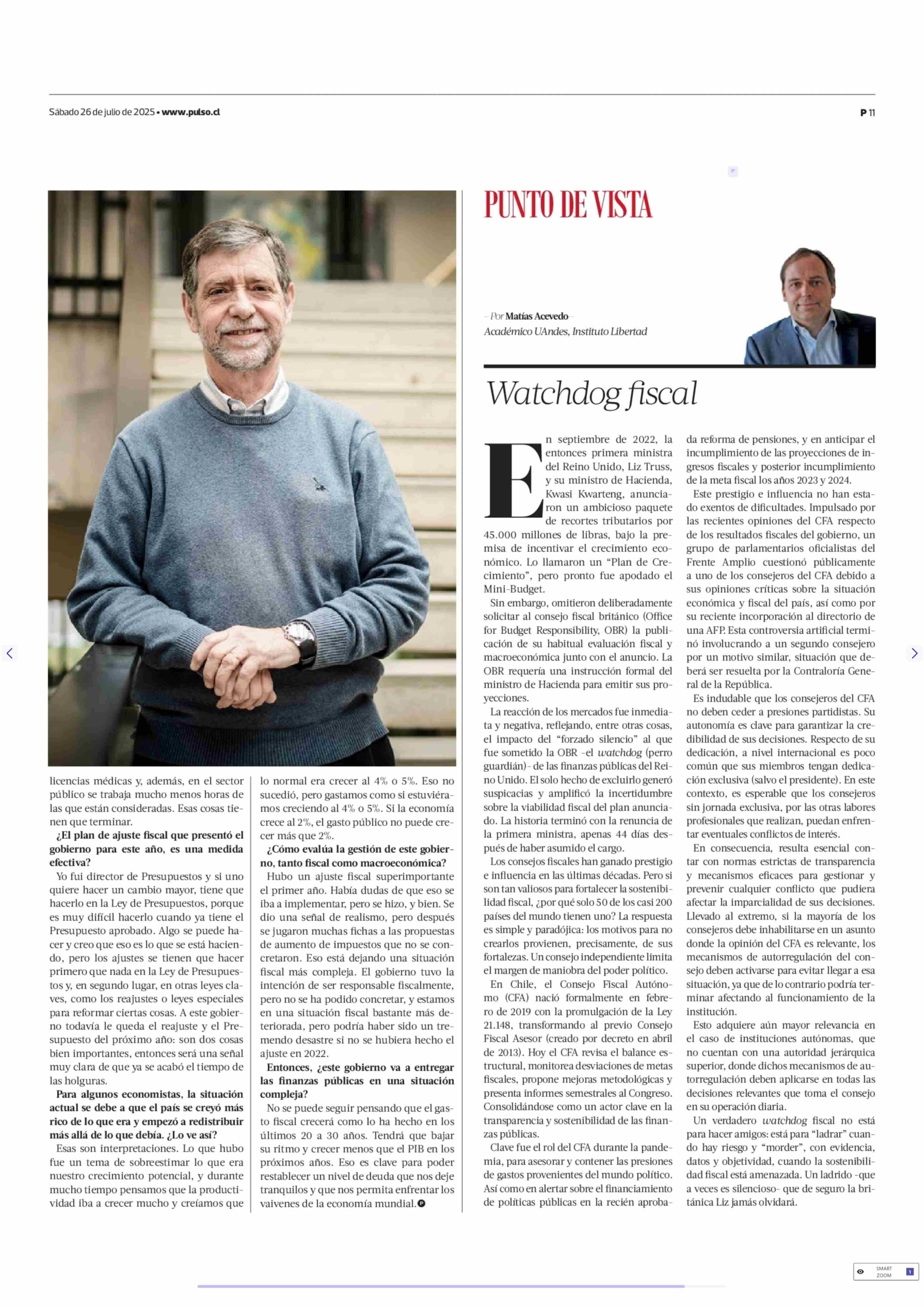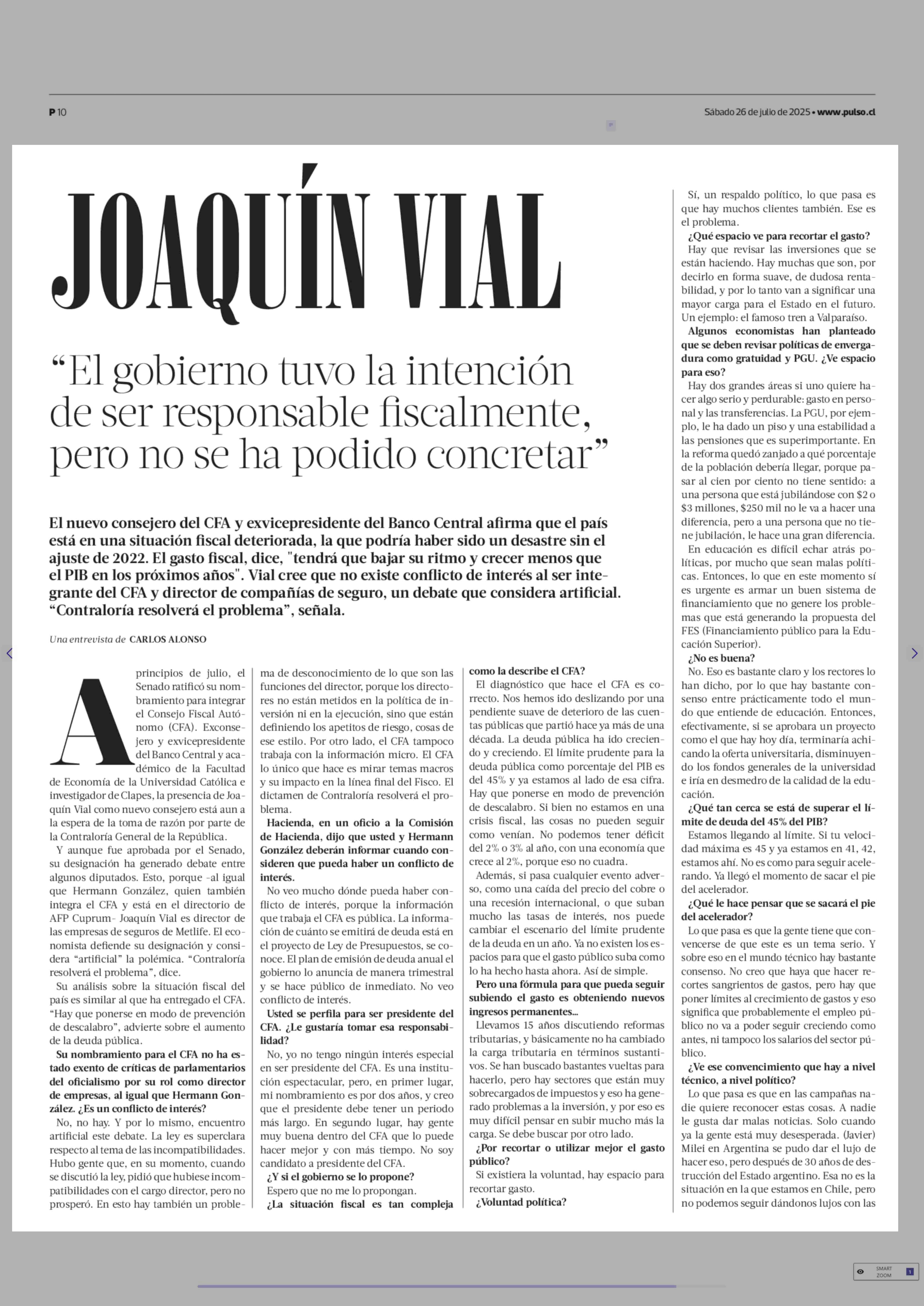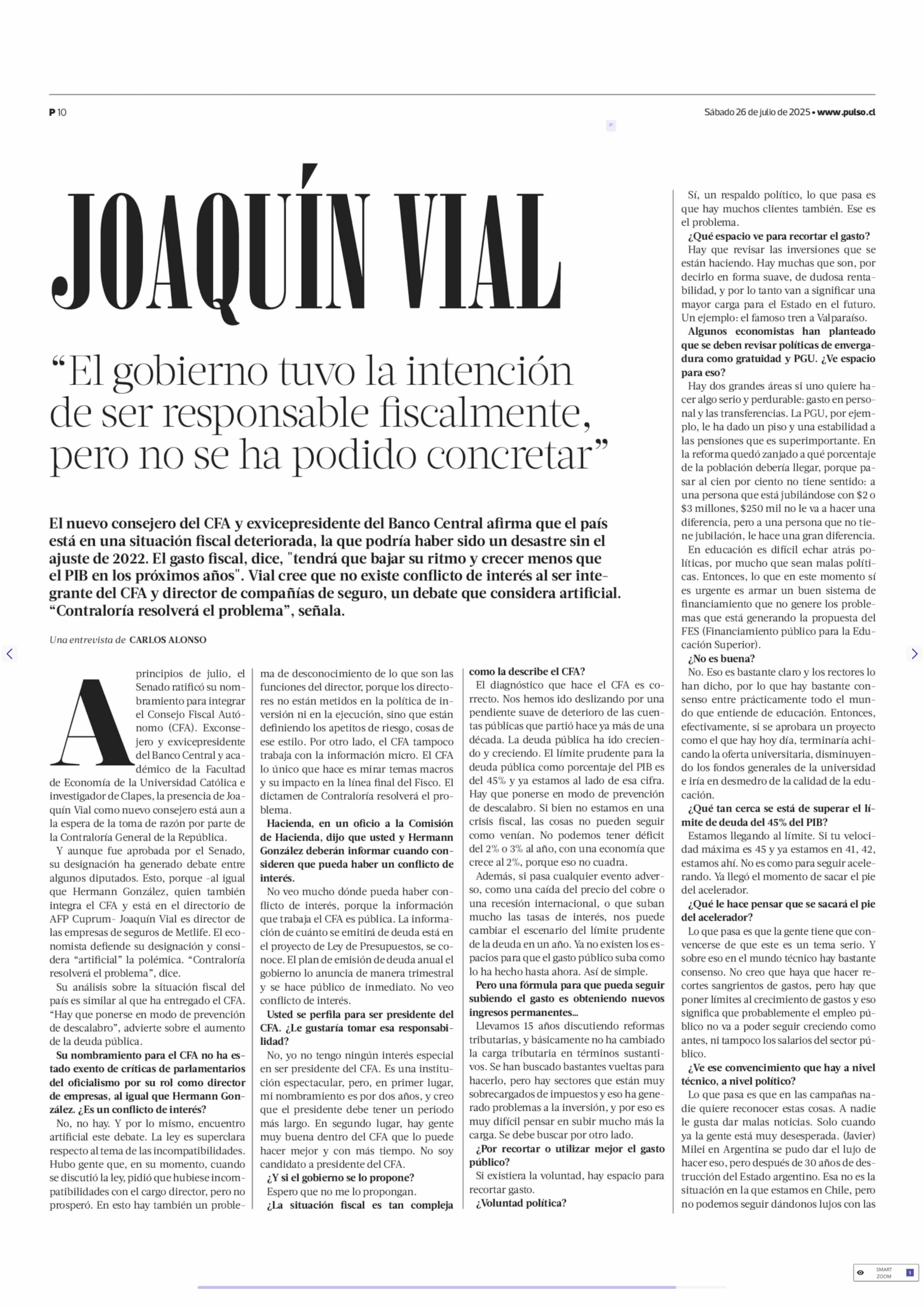 JOAQUÍN VIAL “El gobierno tuvo la intención de ser responsable fiscalmente, pero no se ha podido concretar” 26-07-2025 La Tercera |