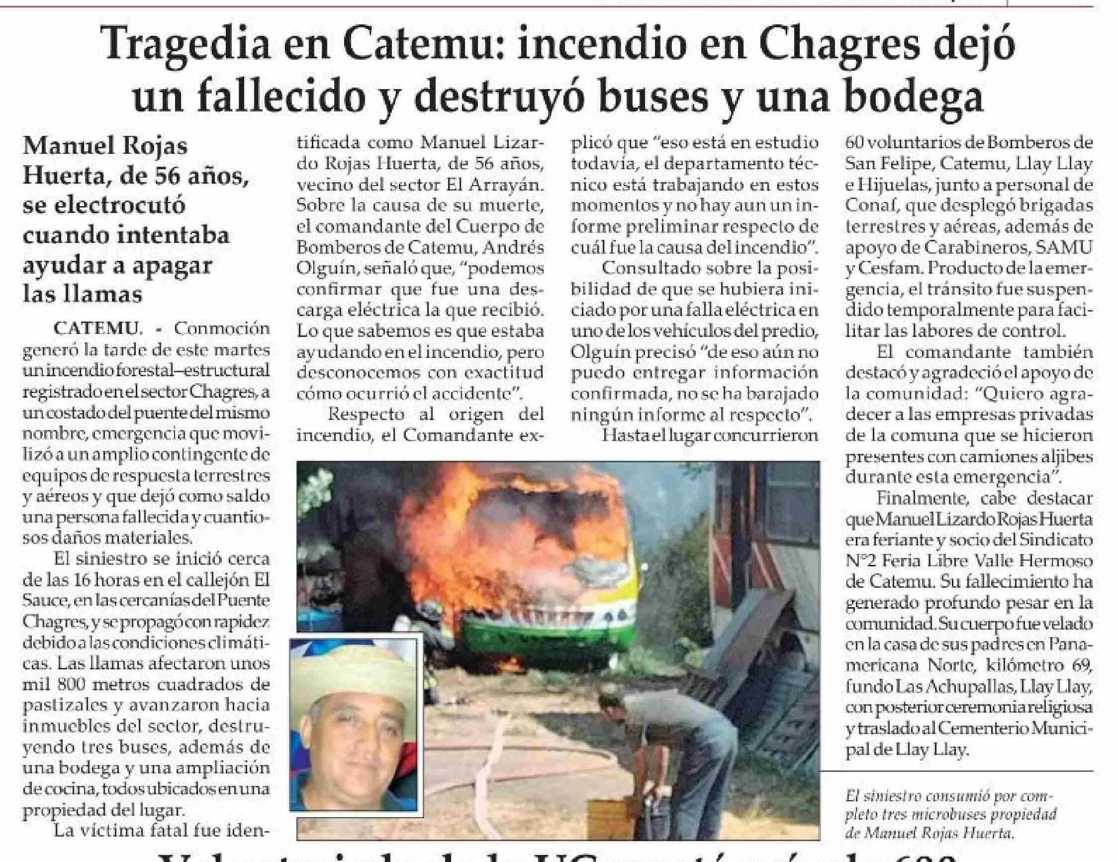Título: Tragedia en Catemu: incendio en Chagres dejó un fallecido y destruyó buses y una bodega