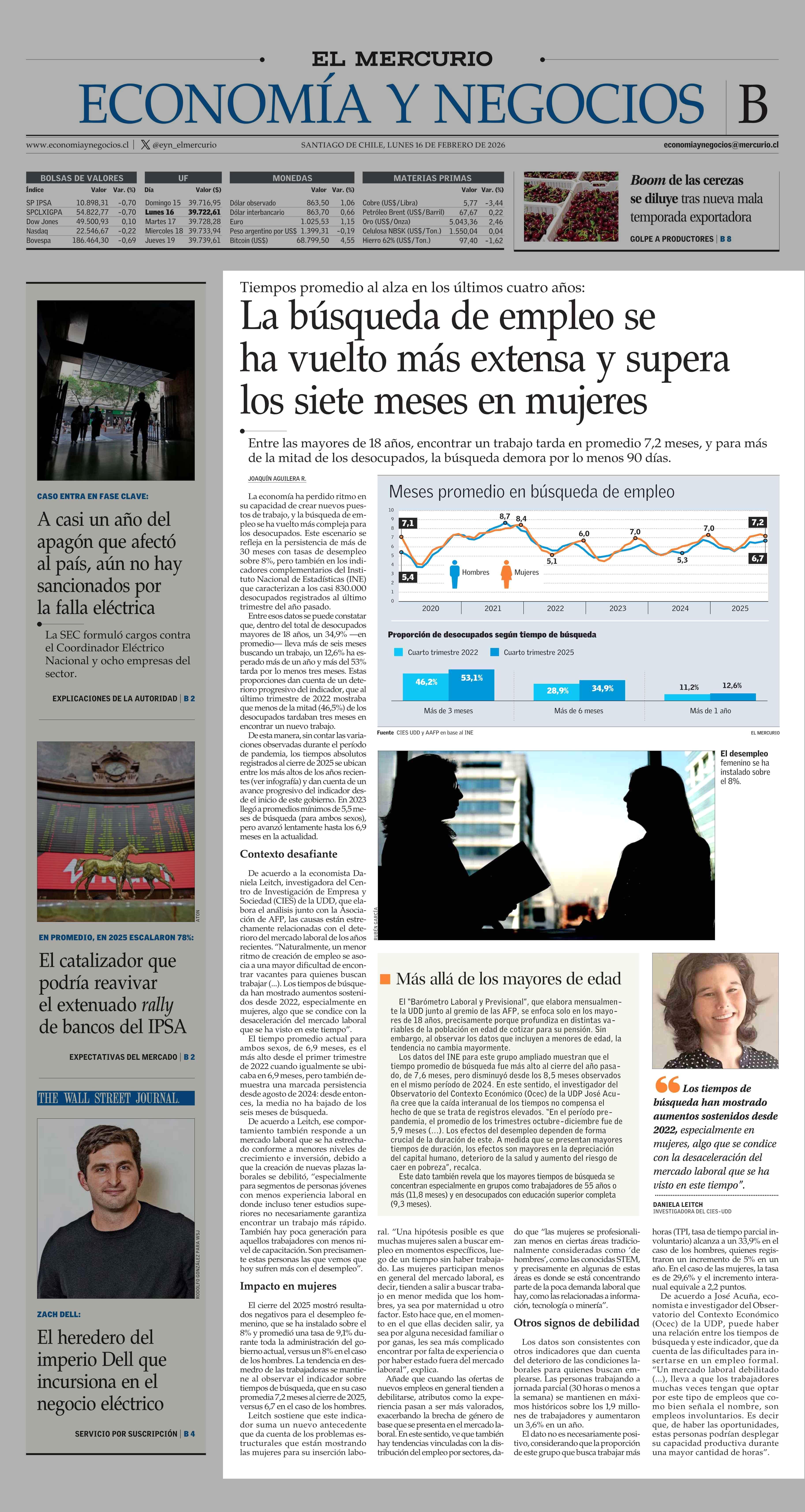 La búsqueda de empleo se ha vuelto más extensa y supera los siete meses en mujeres 16-02-2026 El Mercurio |