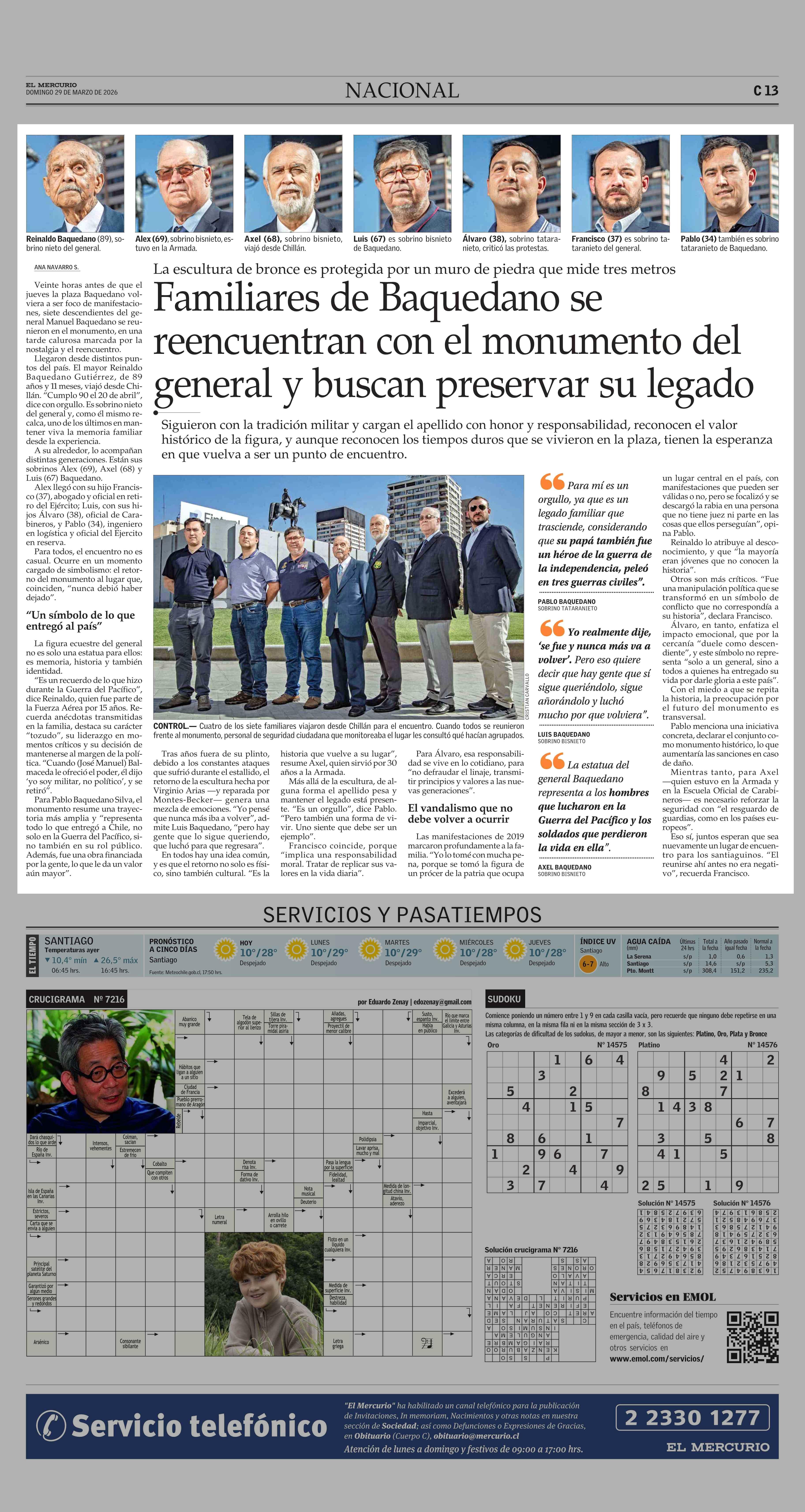 Familiares de Baquedano se reencuentran con el monumento del general y buscan preservar su legado 29-03-2026 El Mercurio |