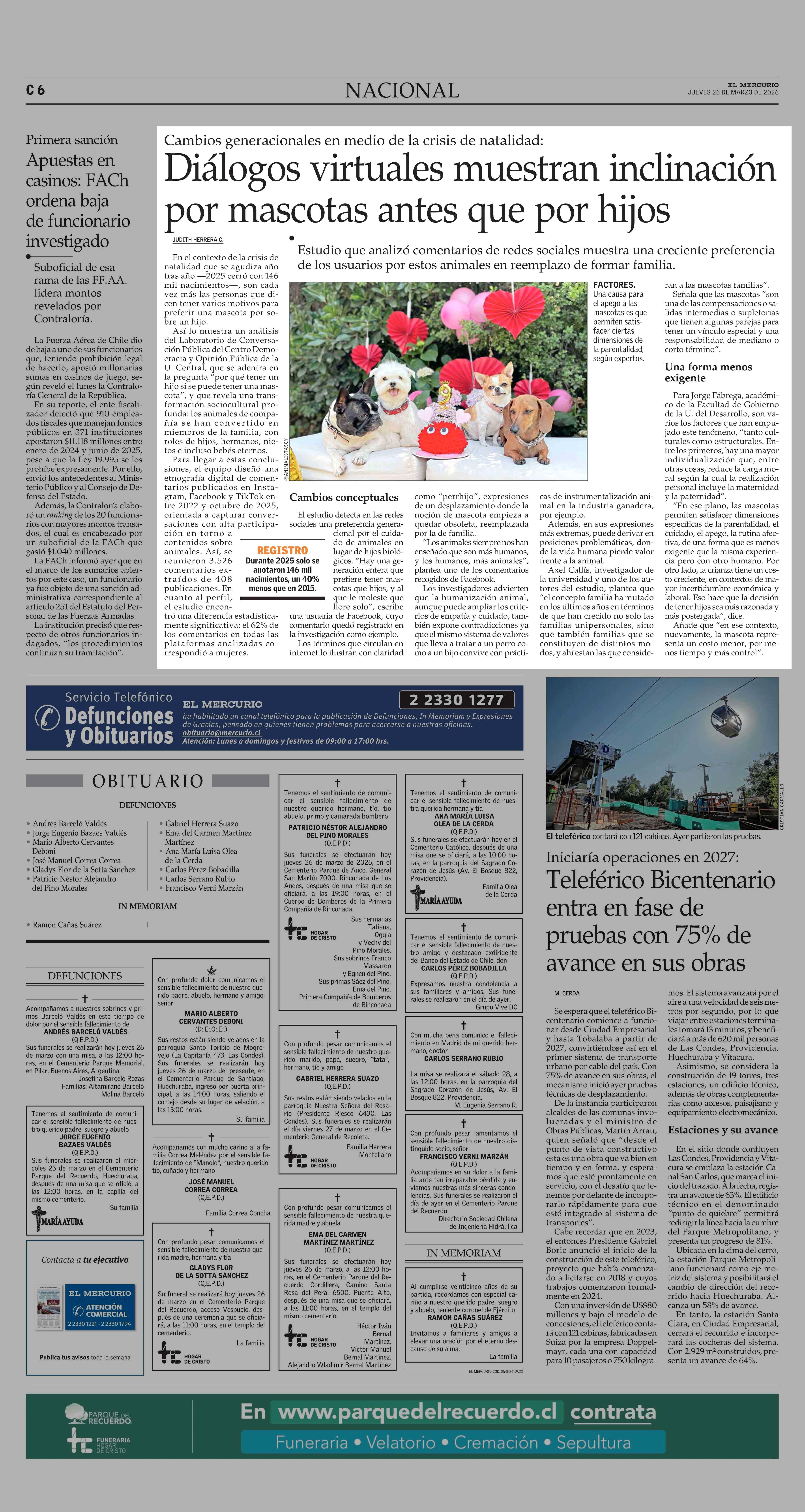 Diálogos virtuales muestran inclinación por mascotas antes que por hijos 26-03-2026 El Mercurio |