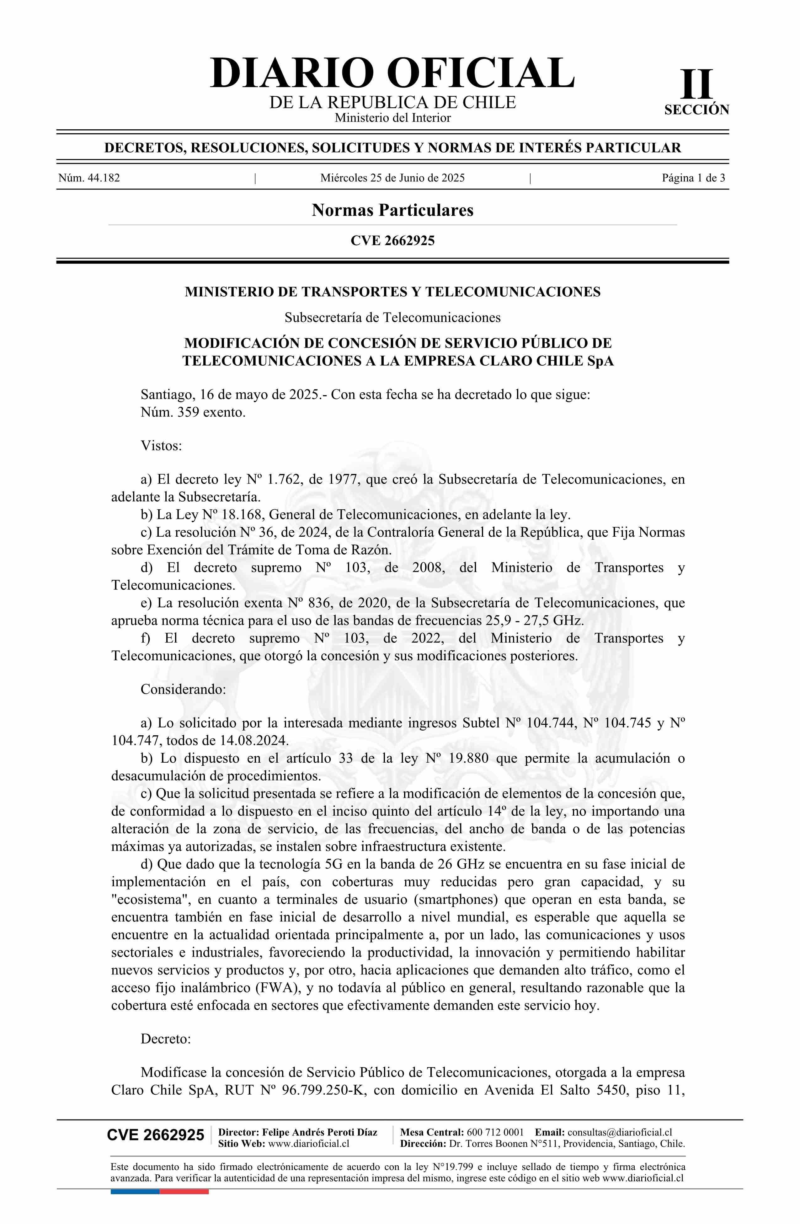 Decreto exento número 359, de 2025.- Modifica concesión de servicio público de telecomunicaciones a la empresa Claro Chile SpA 25-06-2025 Diario Oficial Edición Electrónica |