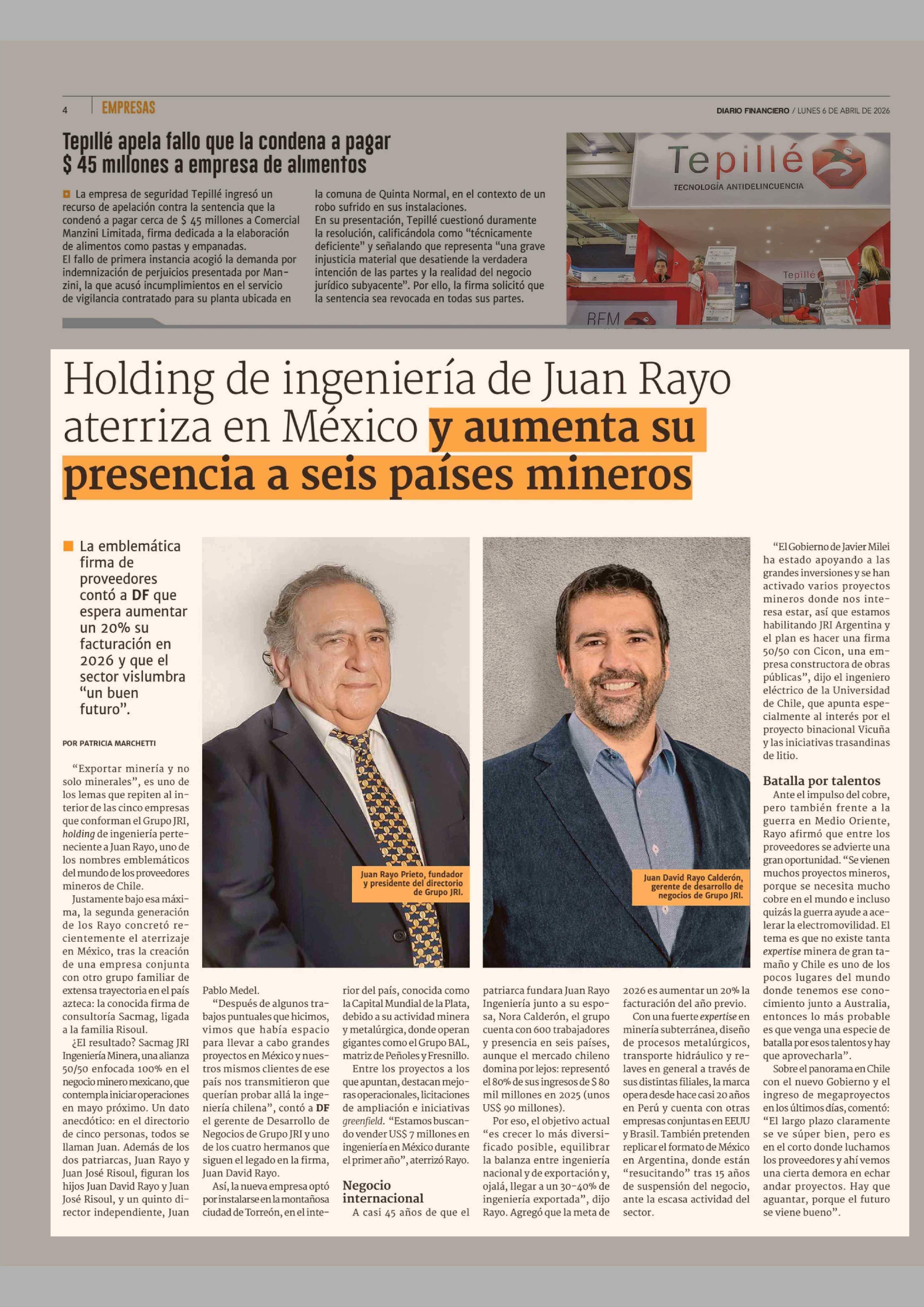 Holding de ingeniería de Juan Rayo aterriza en México y aumenta su presencia a seis países mineros 06-04-2026 Diario Financiero |