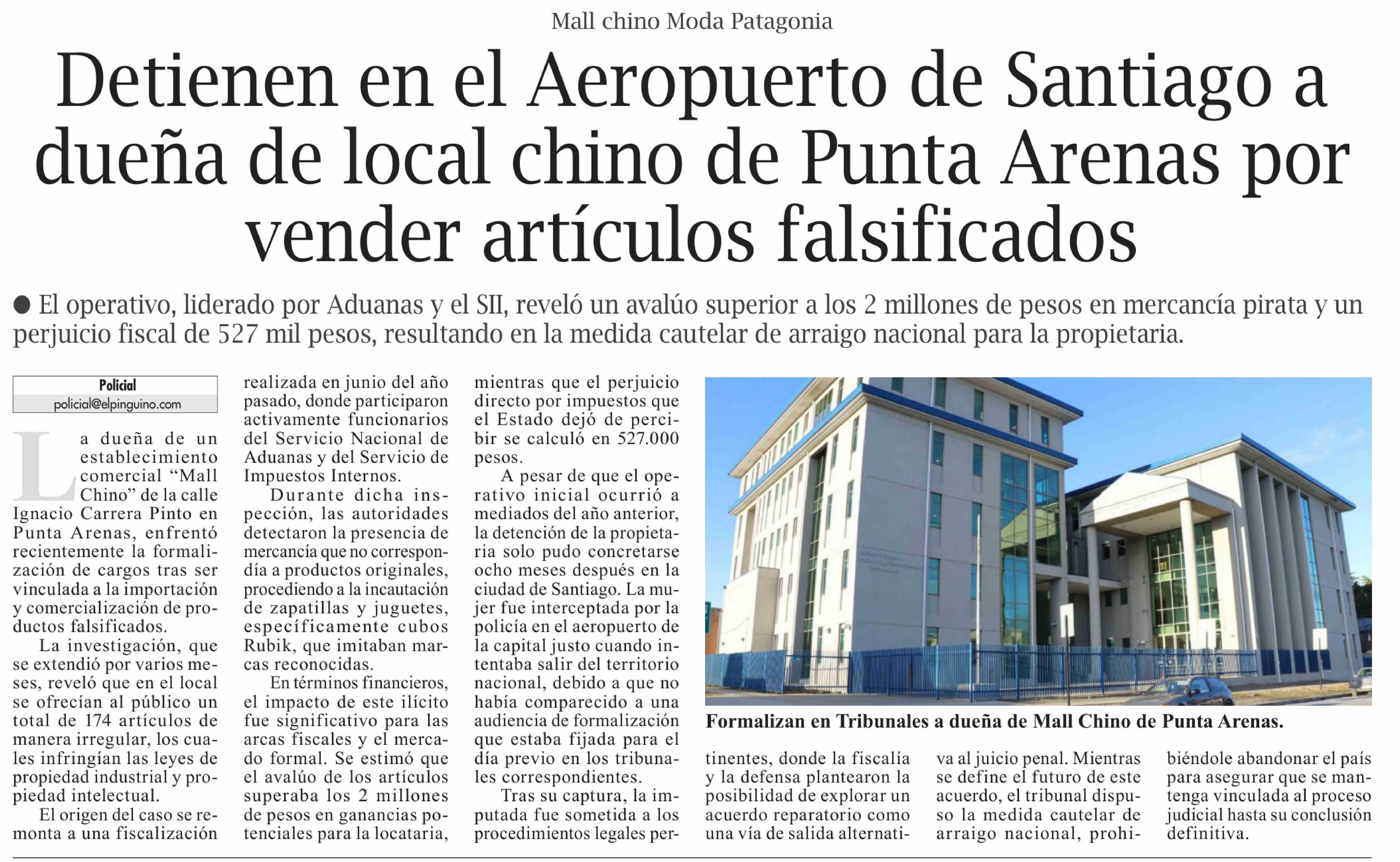 Título: Detienen en el Aeropuerto de Santiago a dueña de local chino de Punta Arenas por vender artículos falsificados