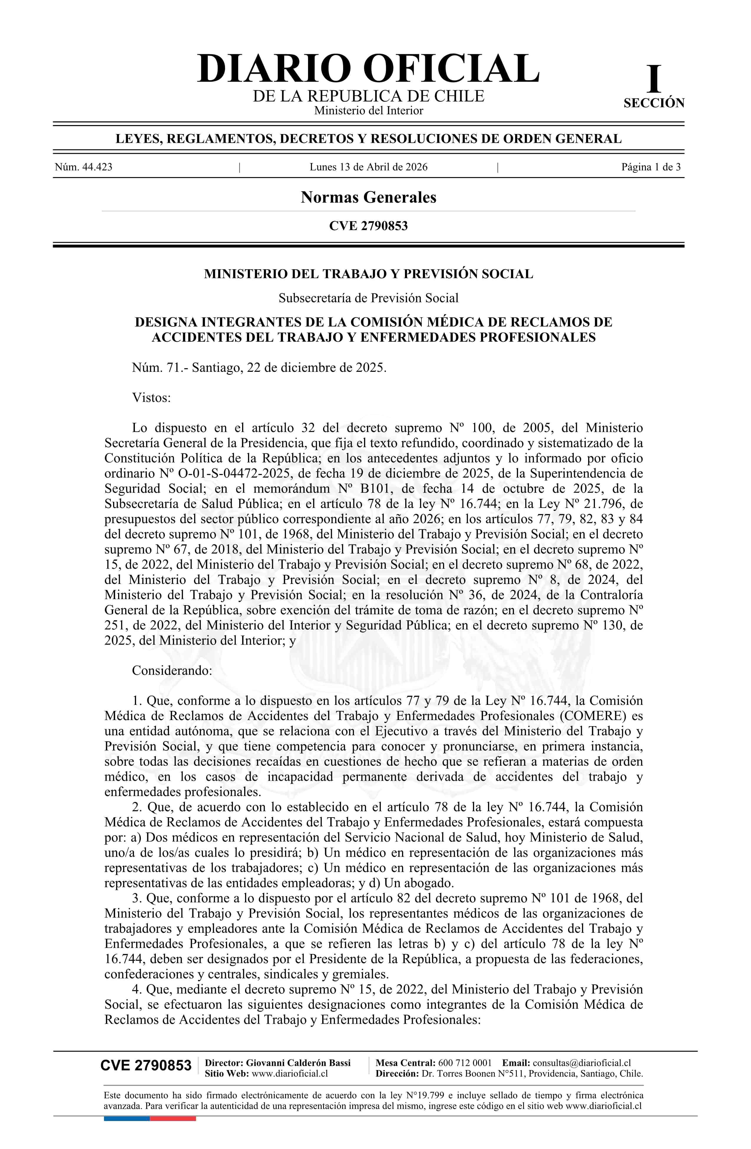Decreto número 71, de 2025.- Designa integrantes de la Comisión Médica de Reclamos de Accidentes del Trabajo y Enfermedades Profesionales 13-04-2026 Diario Oficial Edición Electrónica |