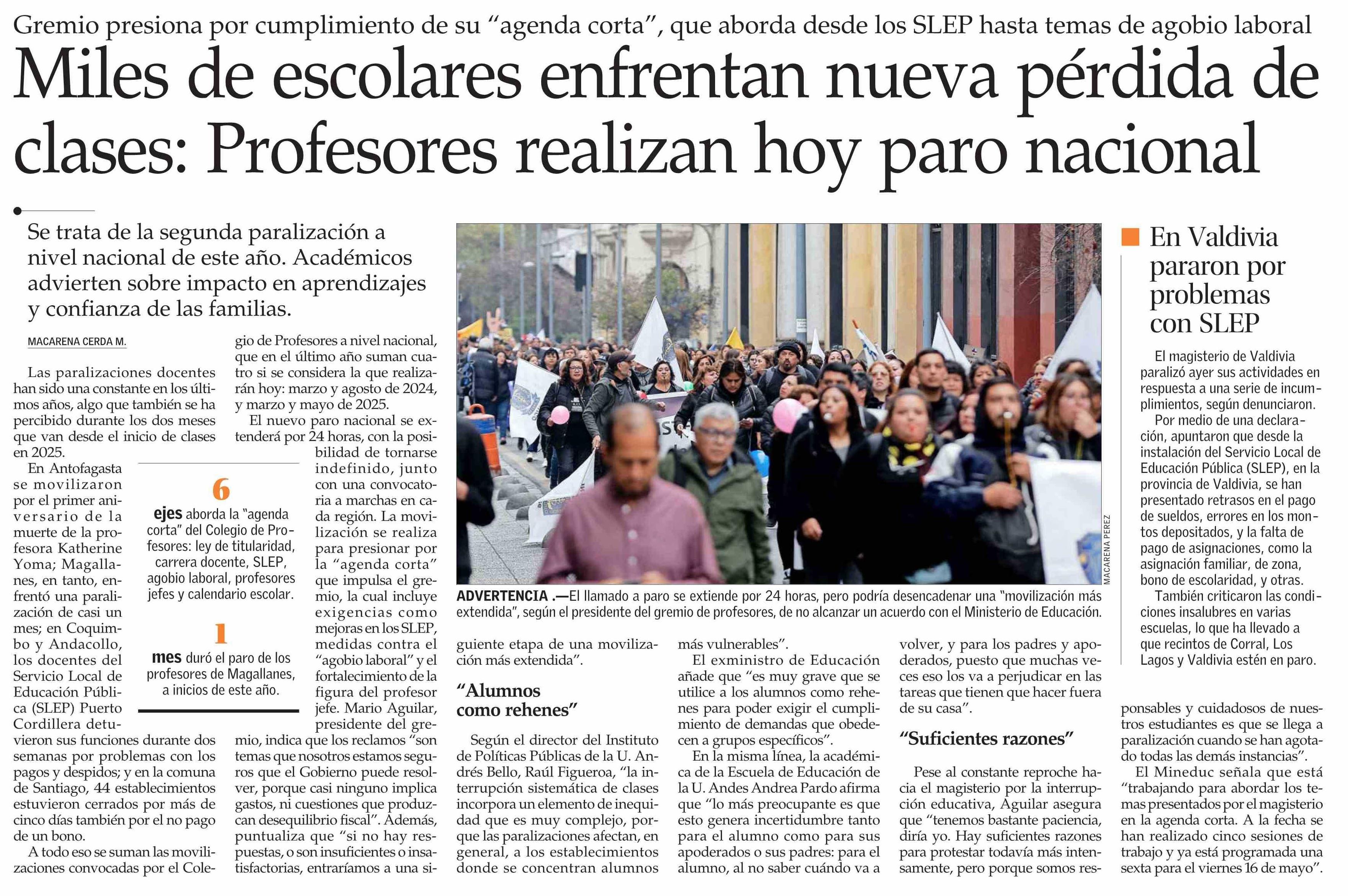 Miles de escolares enfrentan nueva pérdida de clases: Profesores realizan hoy paro nacional 15-05-2025 El Mercurio |
