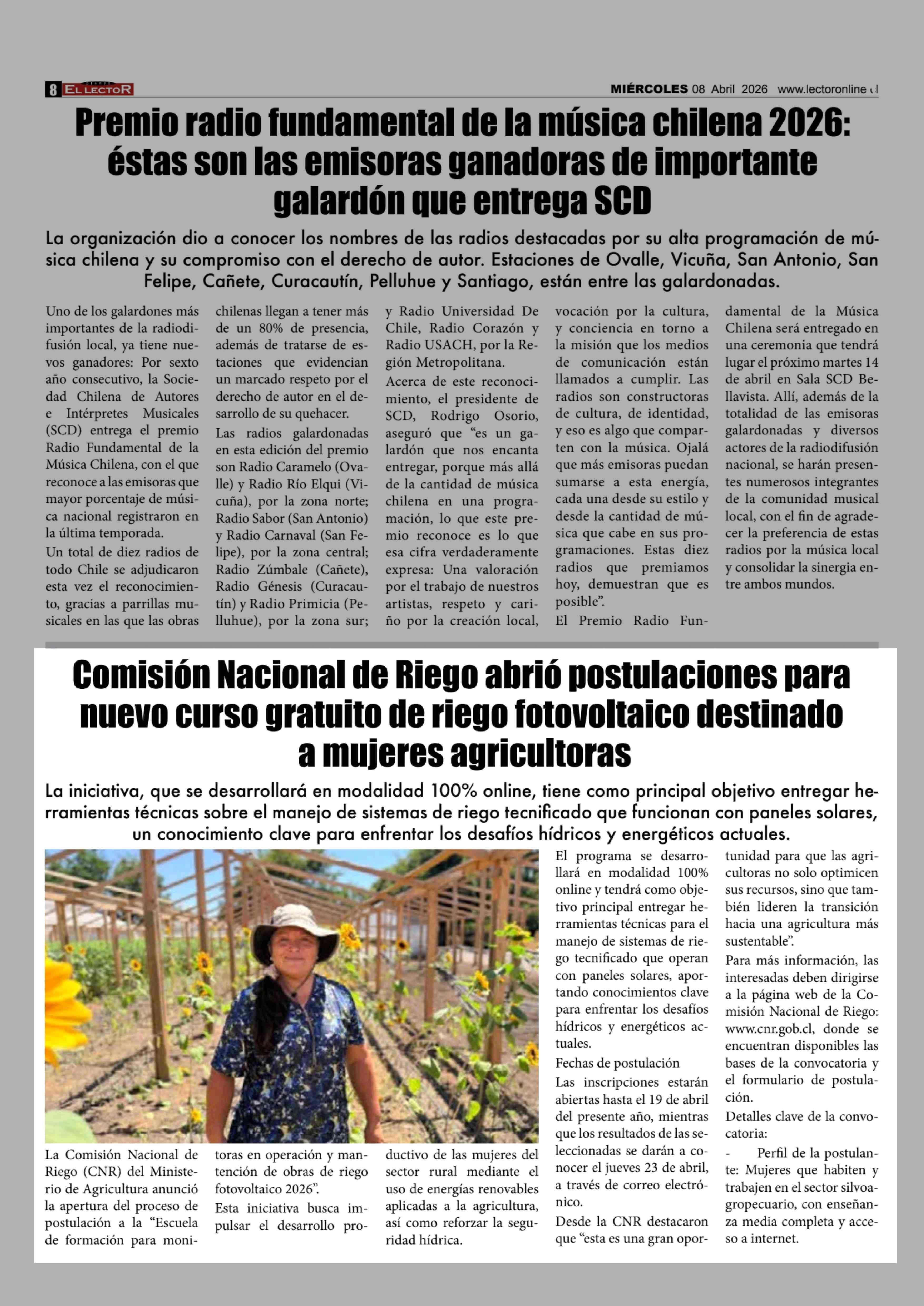 Comisión Nacional de Riego abrió postulaciones para nuevo curso gratuito de riego fotovoltaico destinado a mujeres agricultoras 08-04-2026 El Lector |