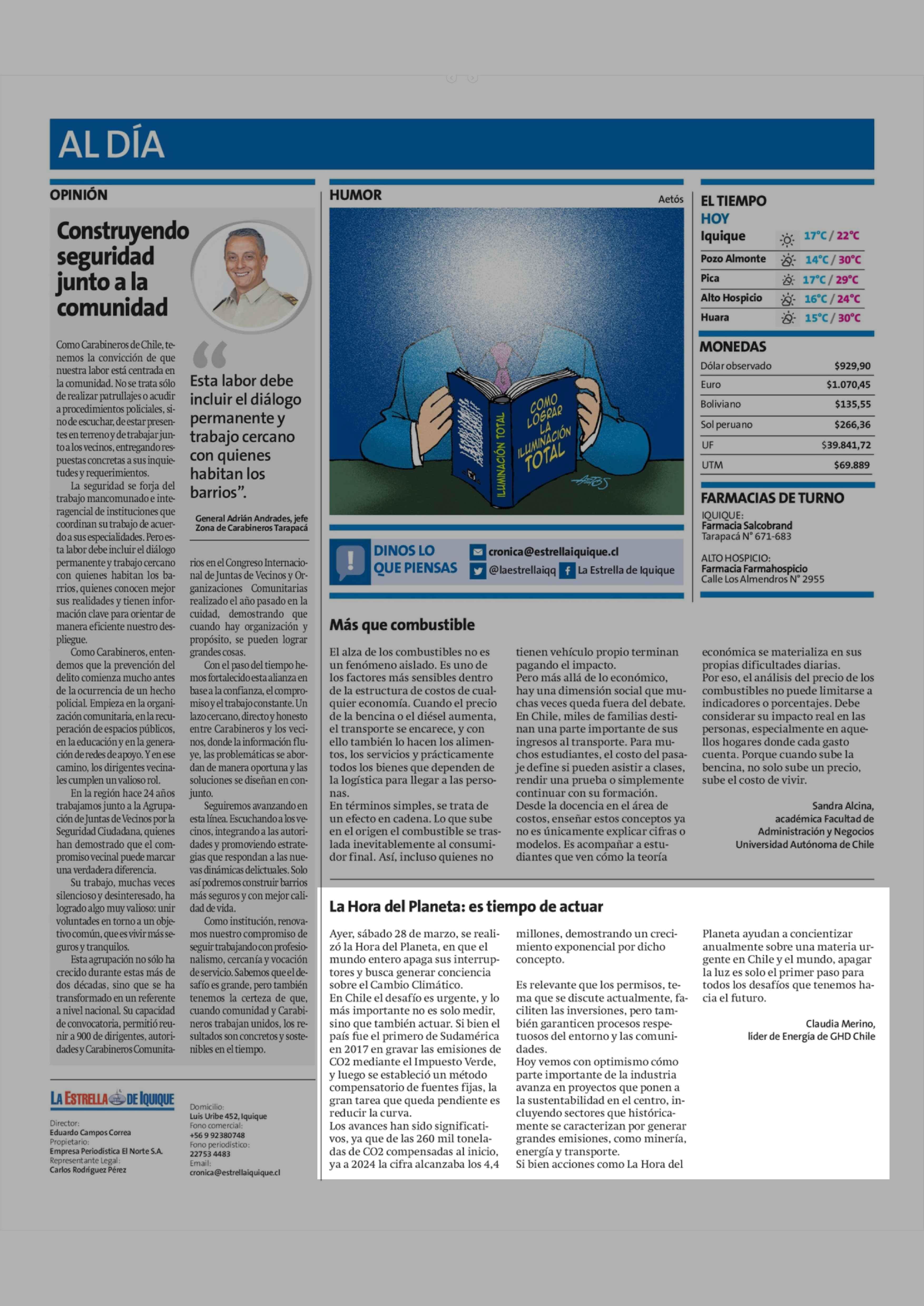 Columnas de Opinión: La Hora del Planeta: es tiempo de actuar 29-03-2026 La Estrella de Iquique |