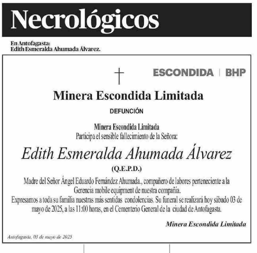 OBITUARIO: Edith Esmeralda Ahumada Álvarez 03-05-2025 El Mercurio de Antofagasta |