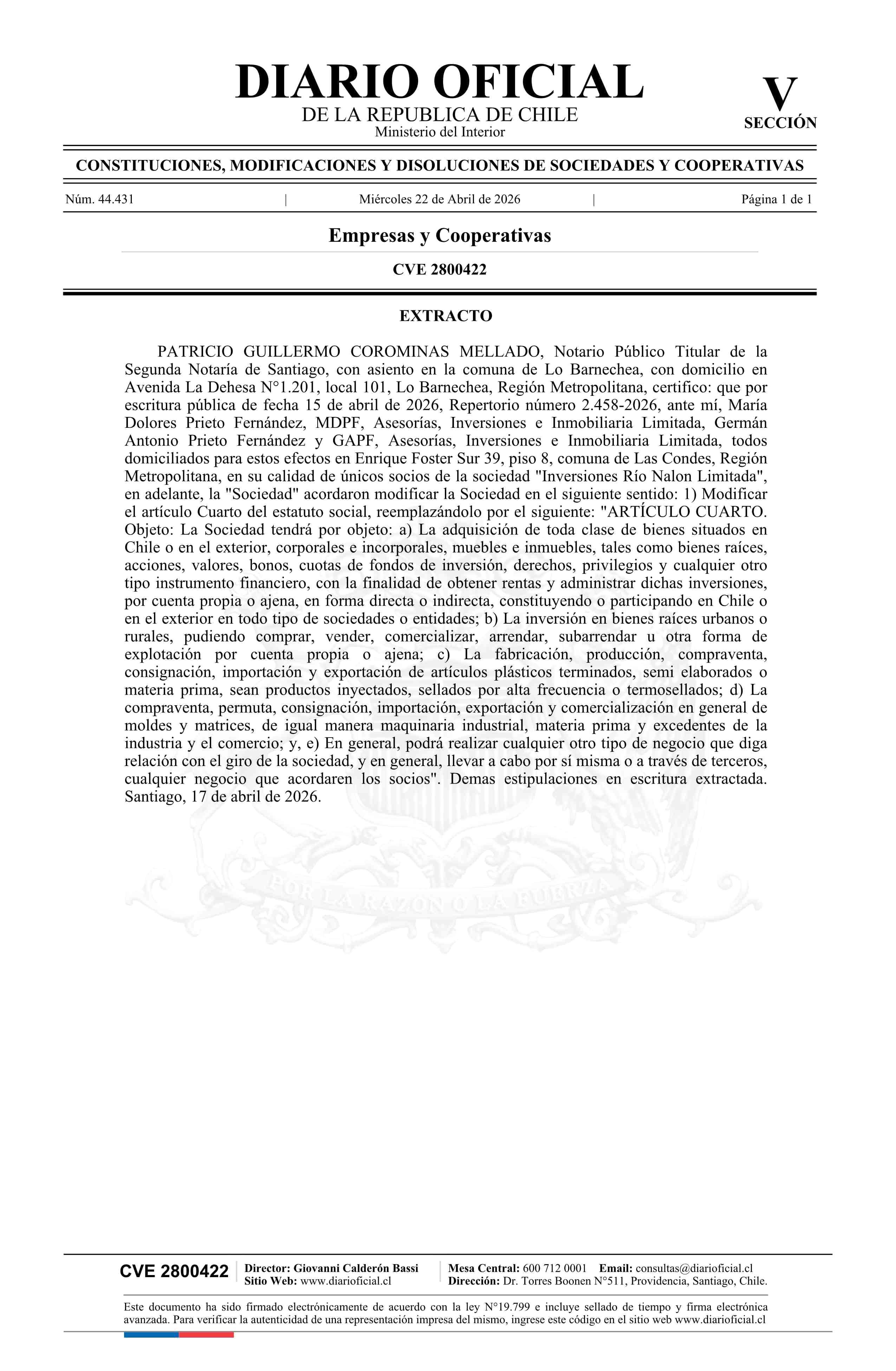 Inversiones Río Nalon Limitada 76.645.891-2* 22-04-2026 Diario Oficial Edición Electrónica |