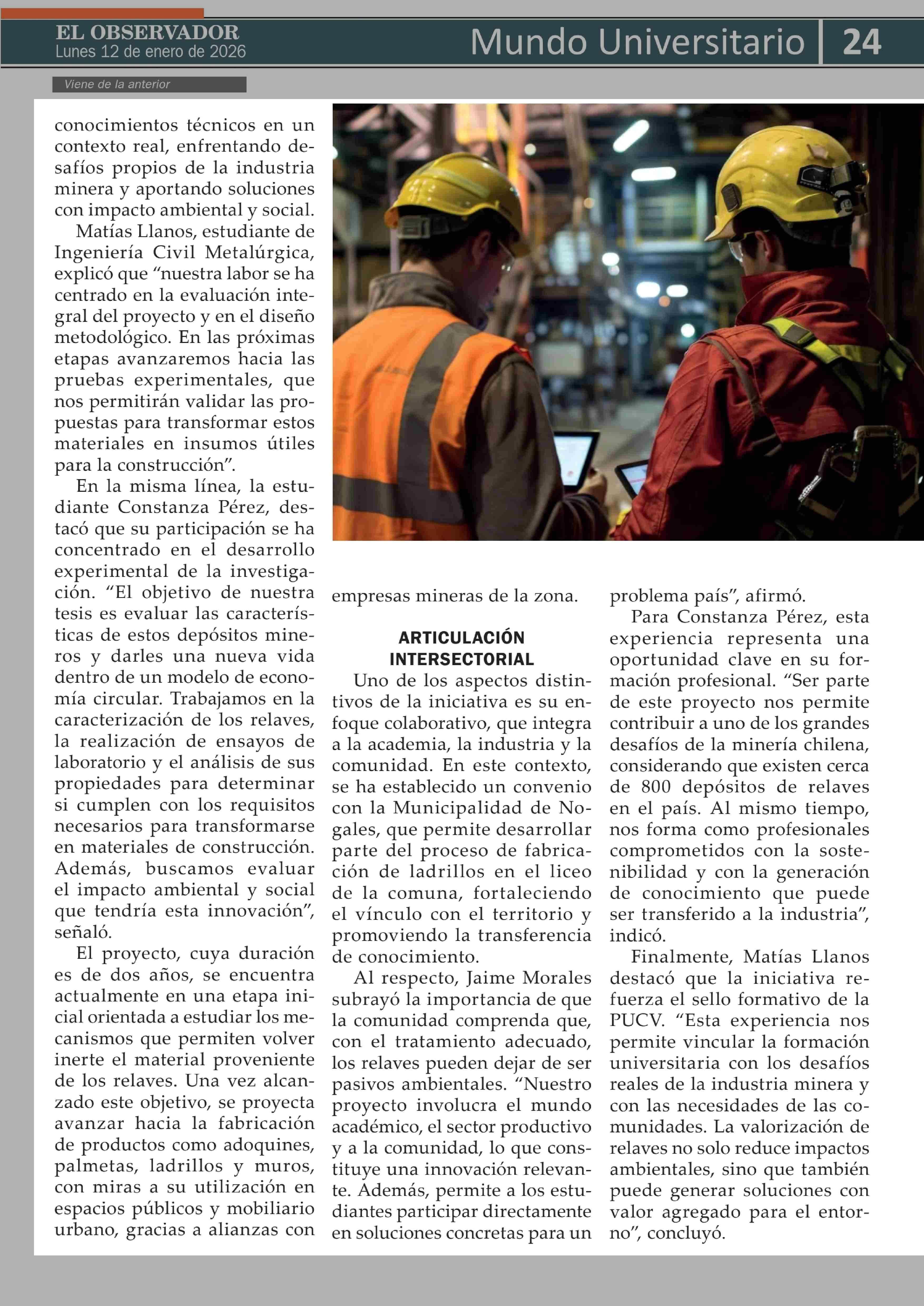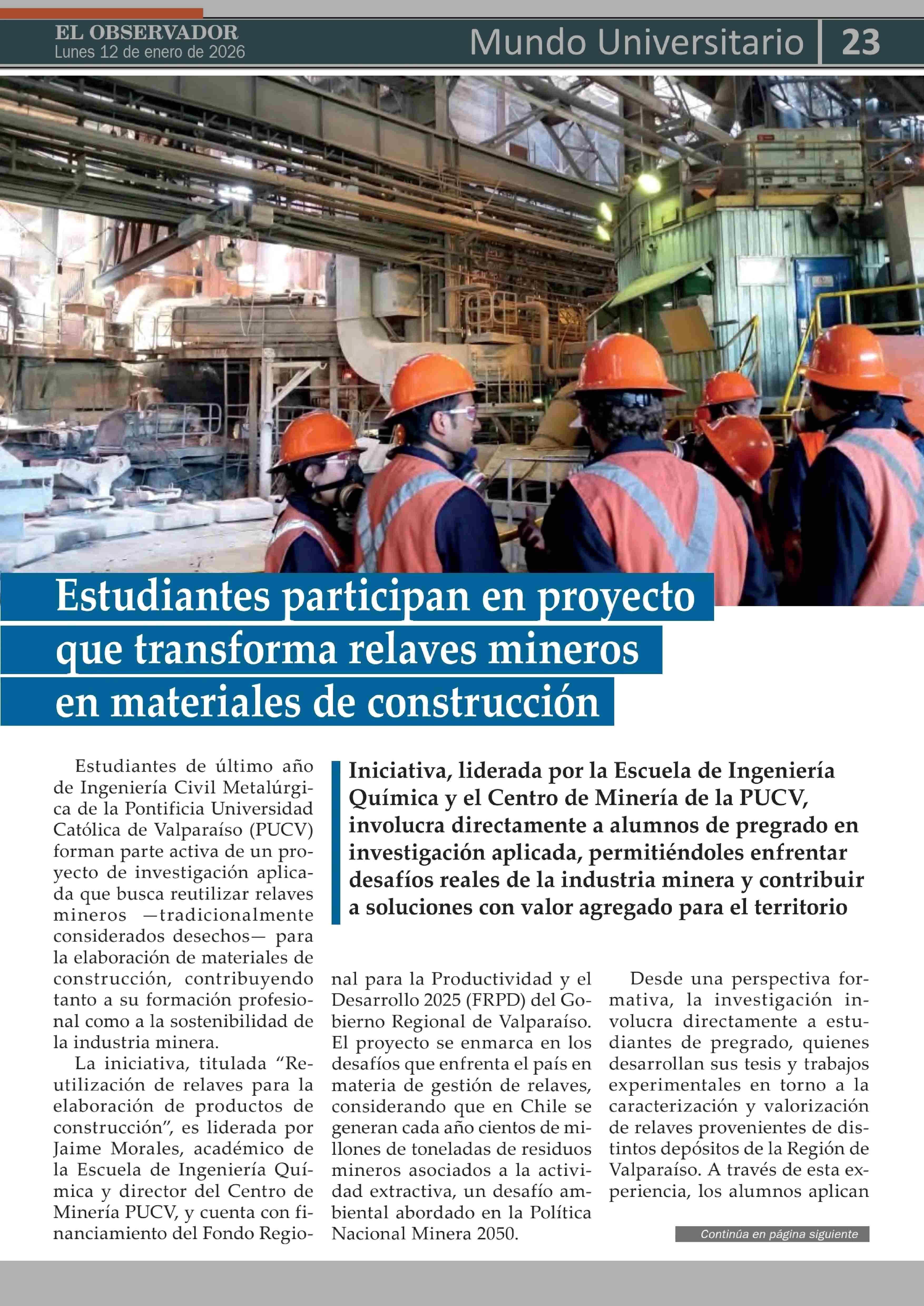 Estudiantes participan en proyecto que transforma relaves mineros en materiales de construcción 12-01-2026 El Observador Vespertino |