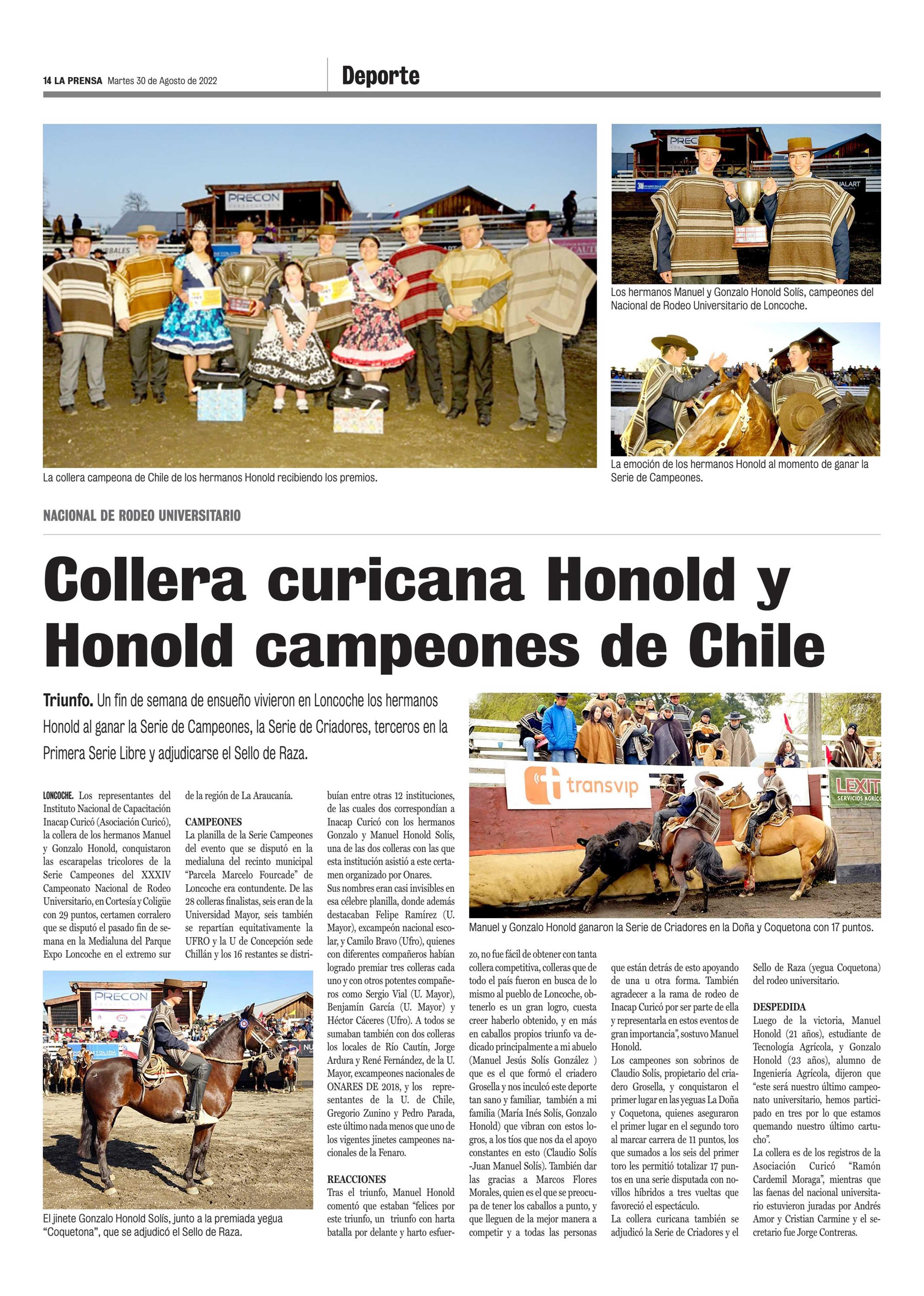 Collera curicana Honold y Honold campeones de Chile 30-08-2022 La Prensa de Curicó |