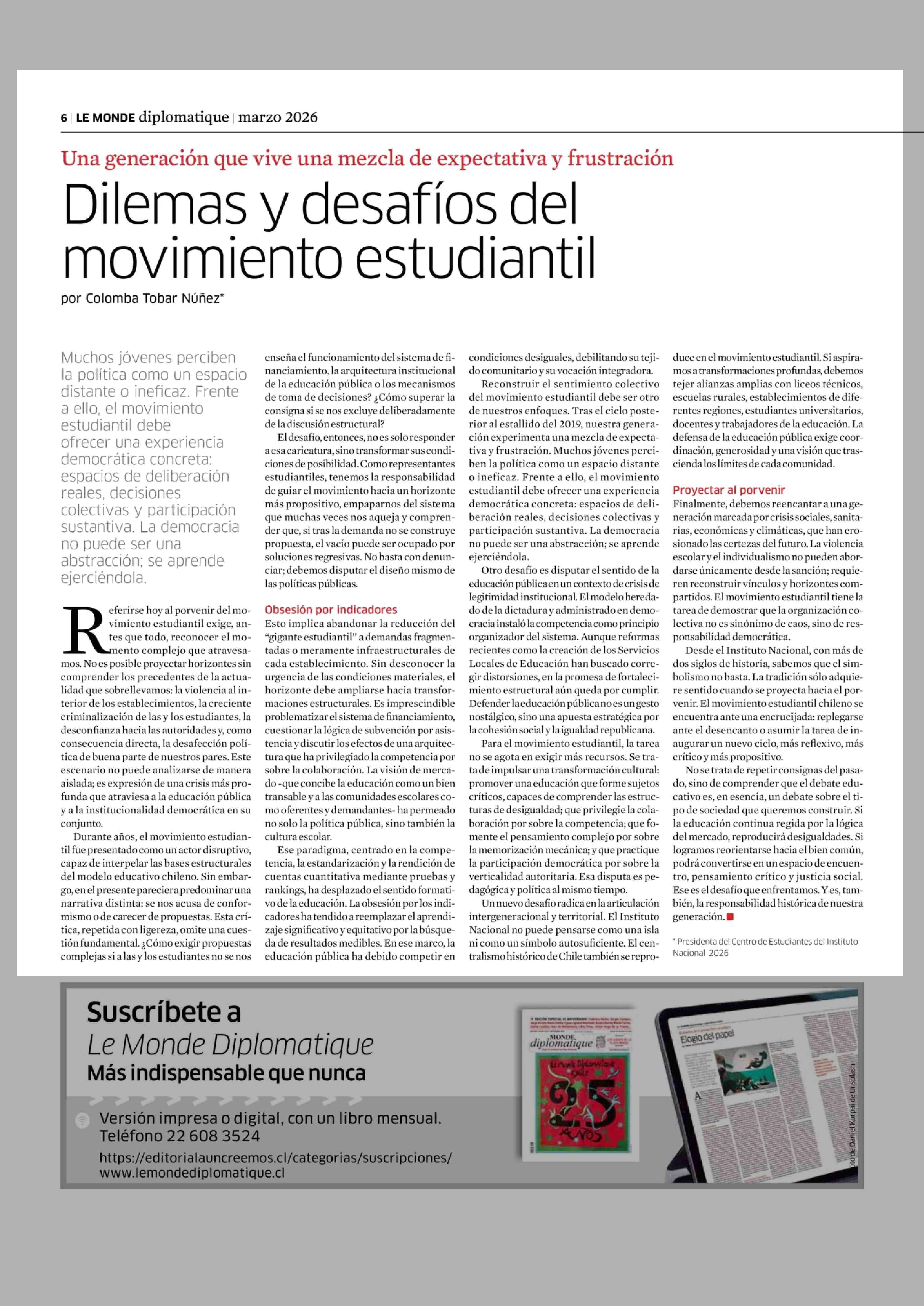 Dilemas desafíos del movimiento estudiantfl 02-03-2026 Le Monde Diplomatique |