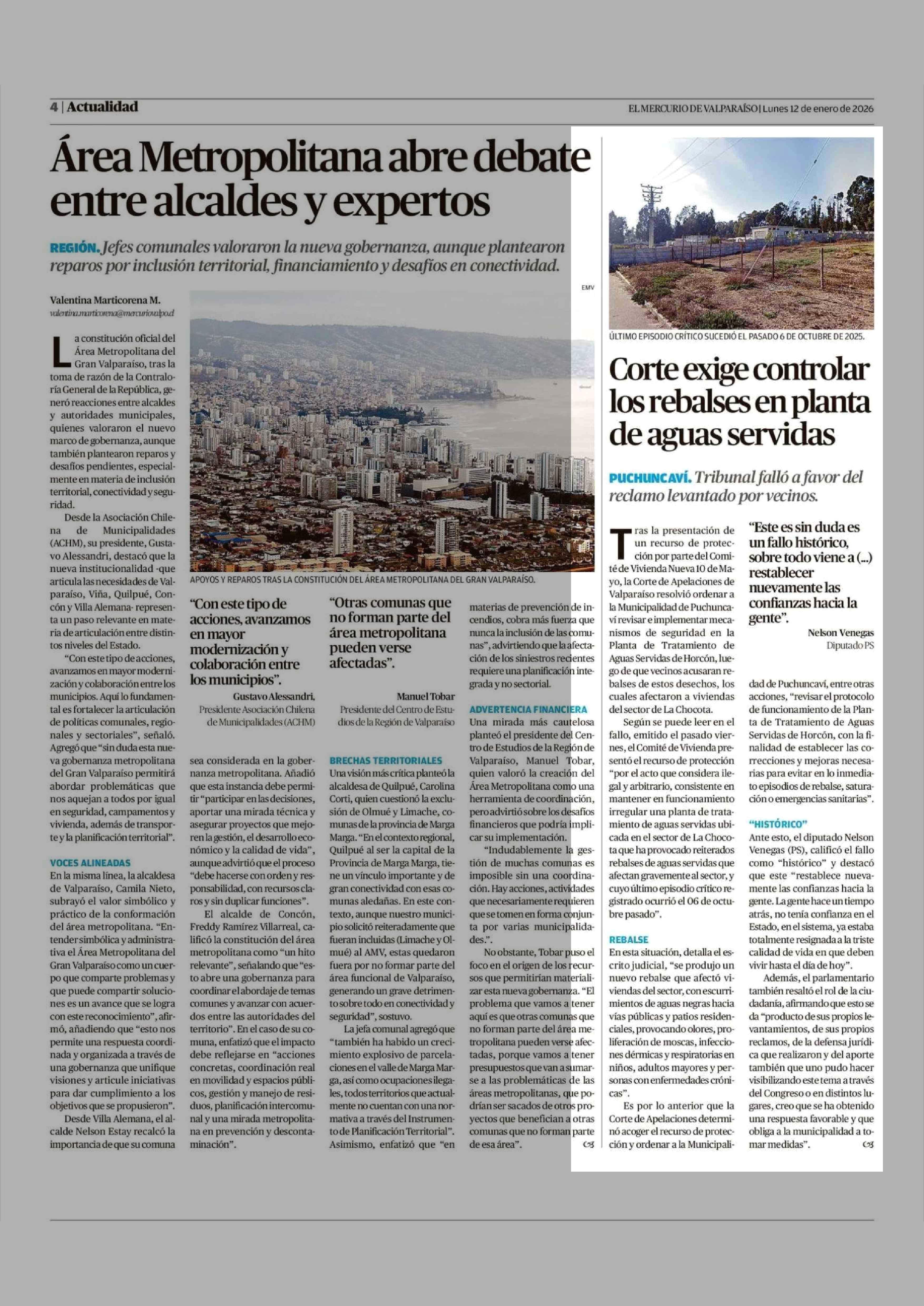 Corte exige controlar los rebalses en planta de aguas servidas 12-01-2026 El Mercurio de Valparaíso |