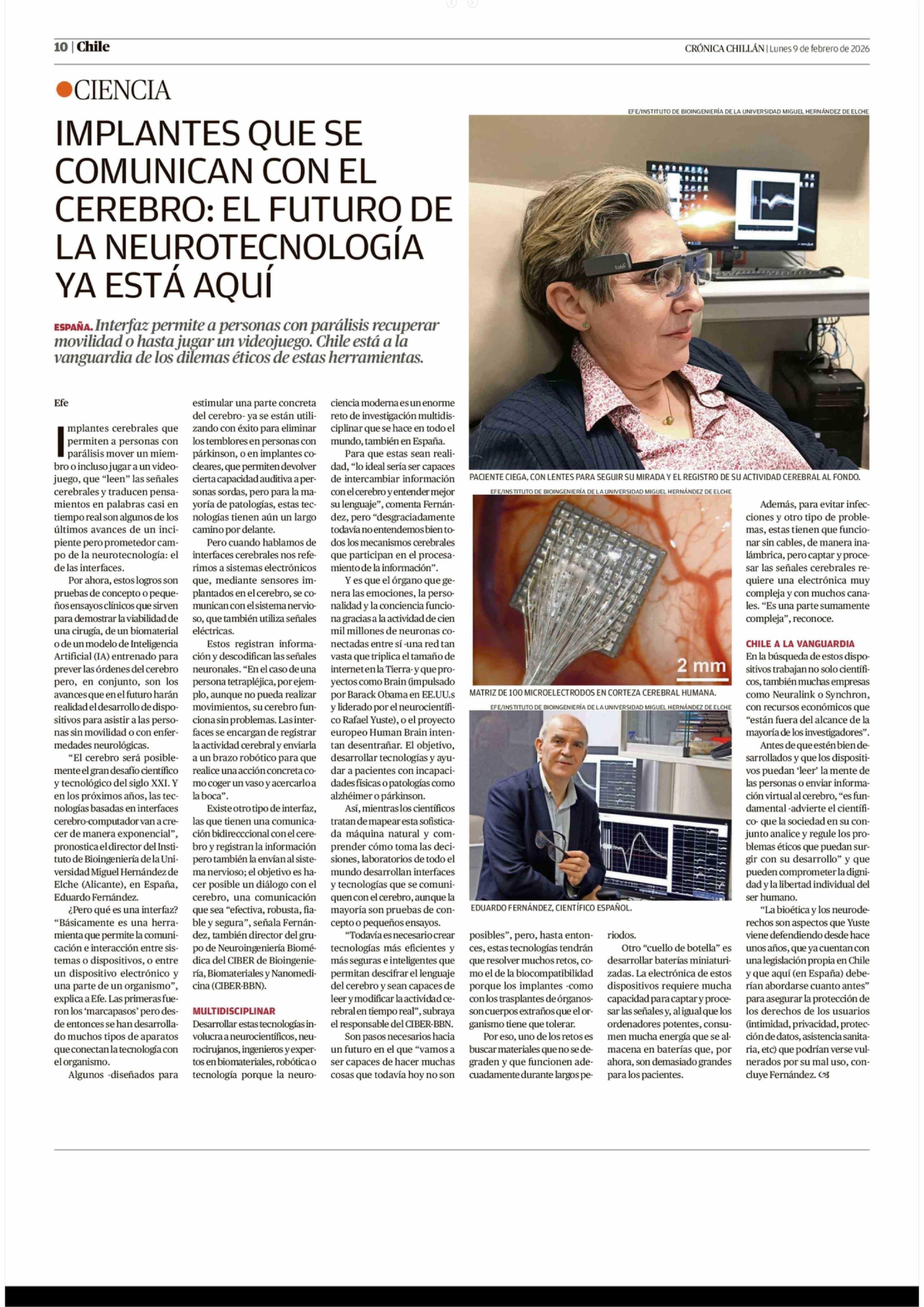 IMPLANTES QUE SE COMUNICAN CON EL CEREBRO: EL FUTURO DE LA NEUROTECNOLOGÍA YA ESTÁ AQUÍ 09-02-2026 Crónica de Chillán |