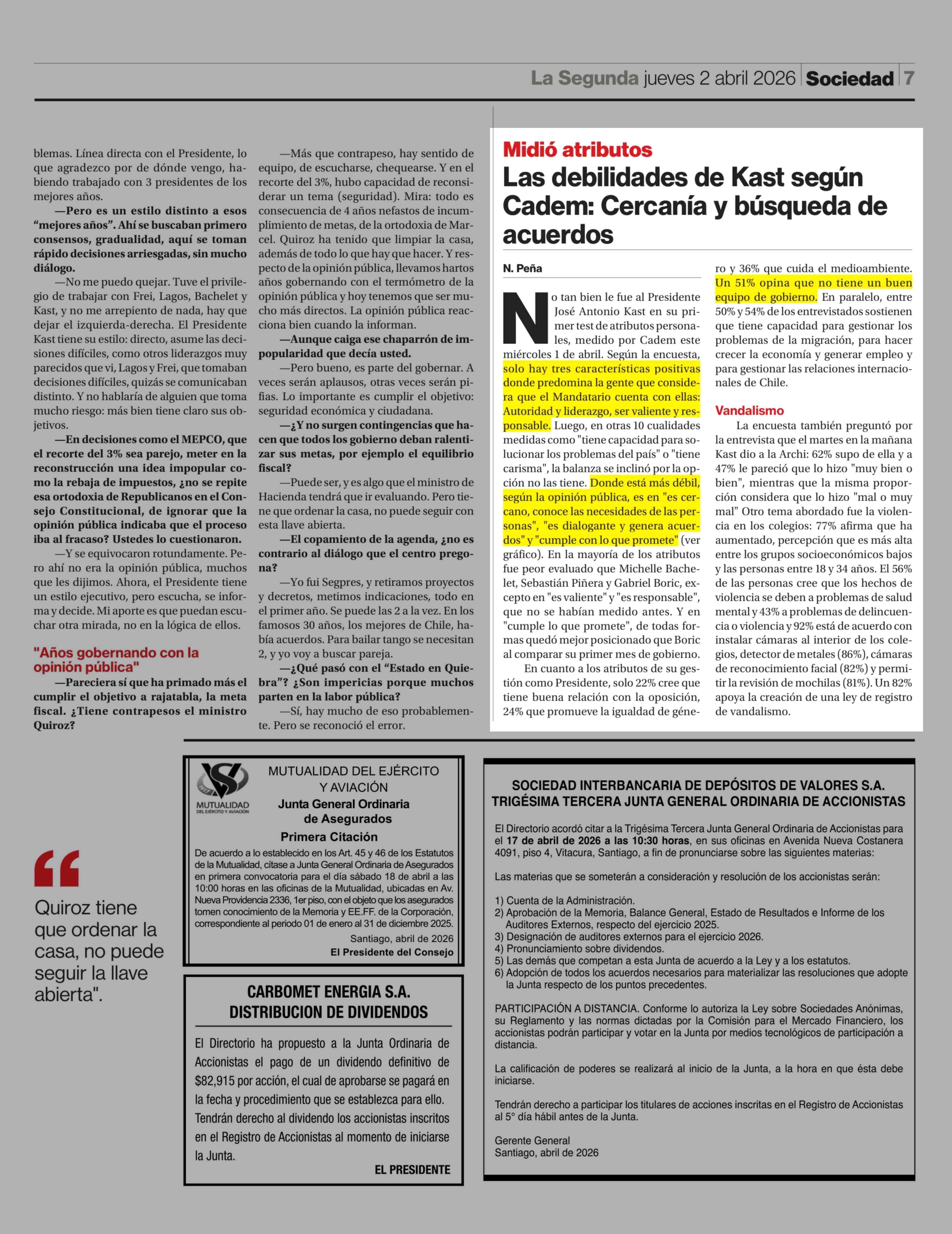 Las debilidades de Kast según Cadem: Cercanía y búsqueda de acuerdos 02-04-2026 La Segunda |