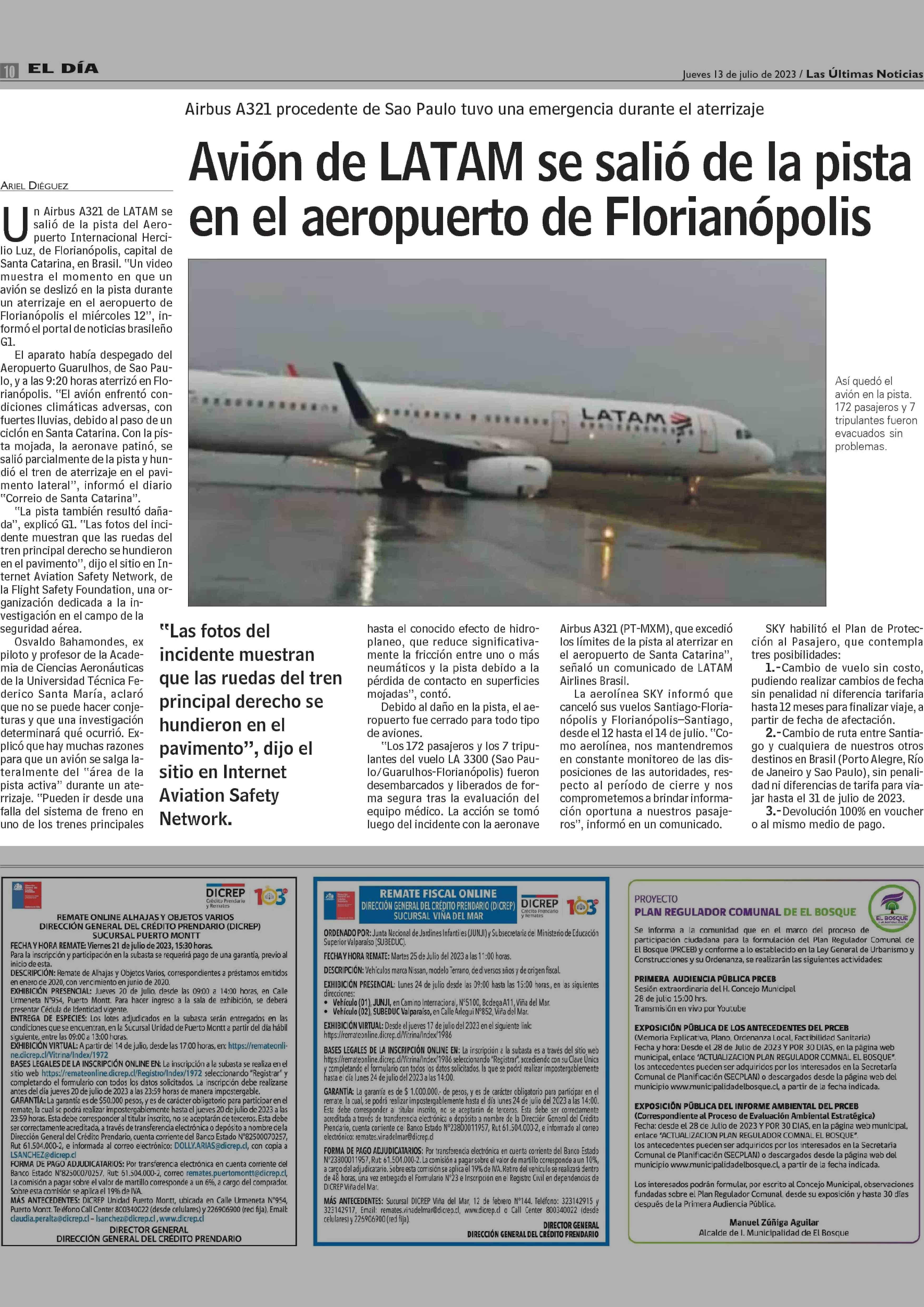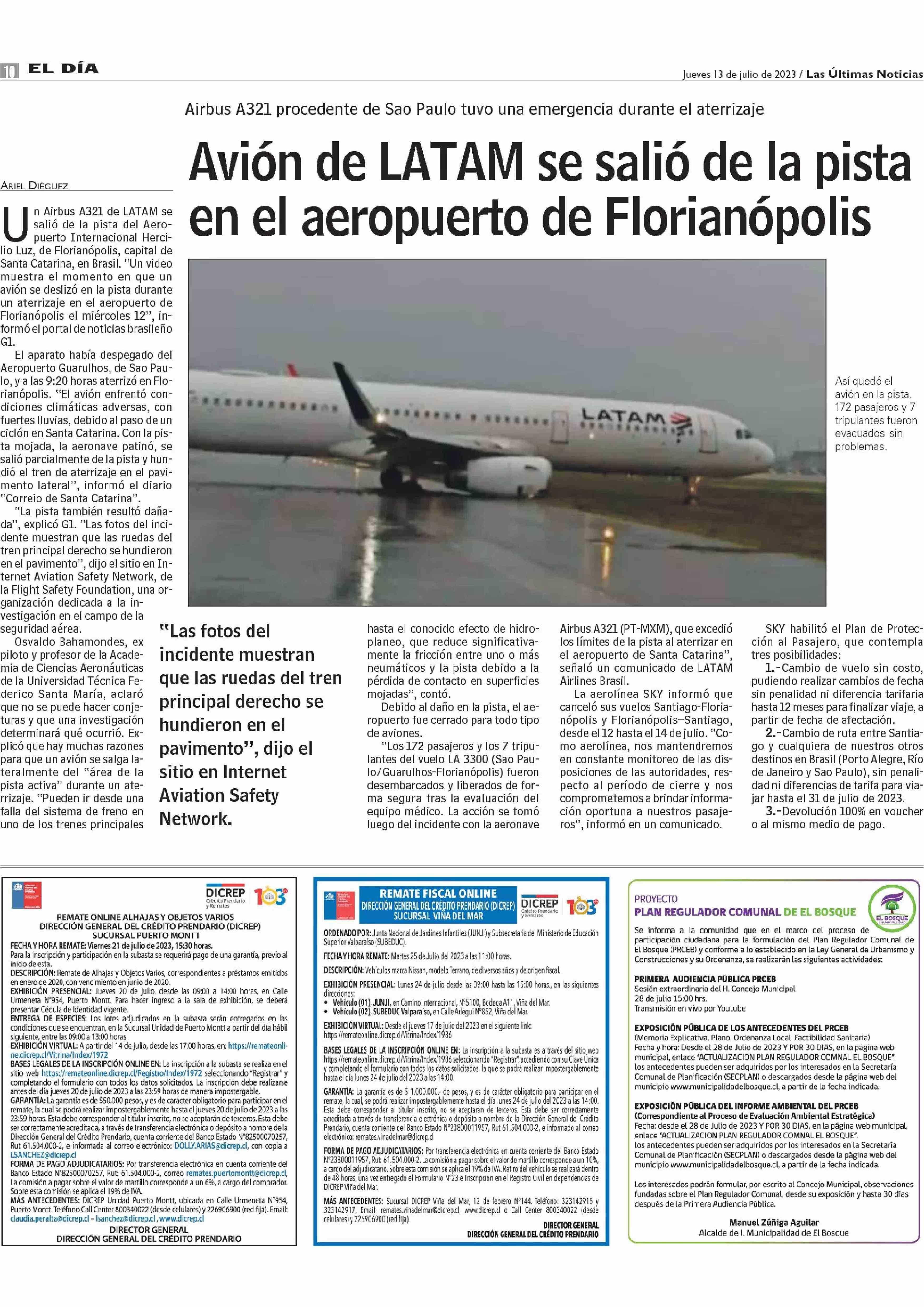 Avión de LATAM se salió de la pista en el aeropuerto de Florianópolis 13-07-2023 Las Últimas Noticias |