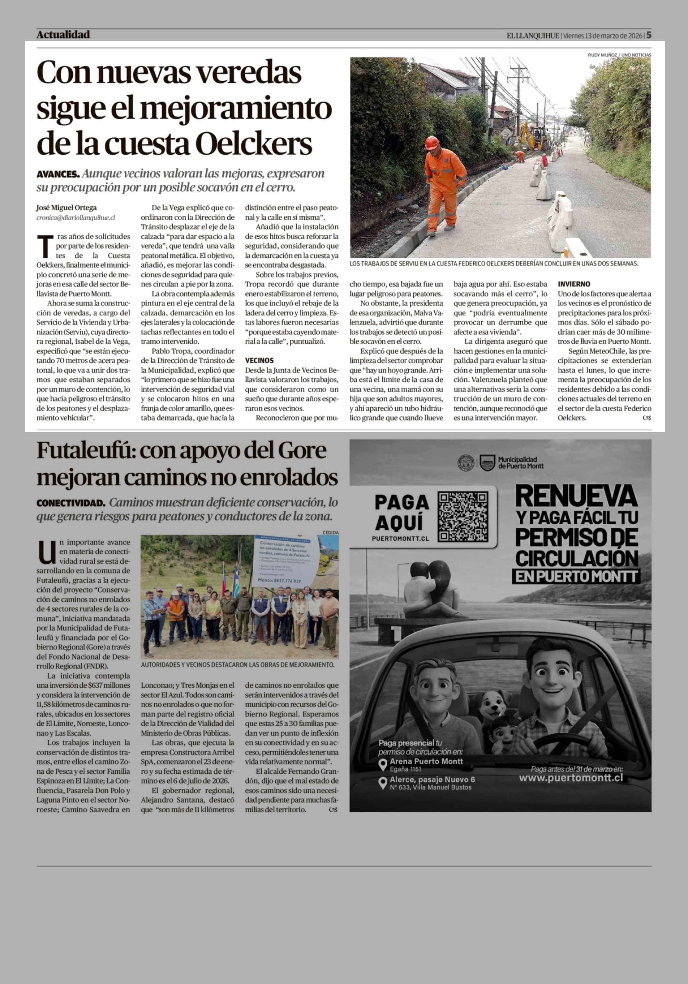 Con nuevas veredas sigue el mejoramiento de la cuesta Oelckers 13-03-2026 El Llanquihue |