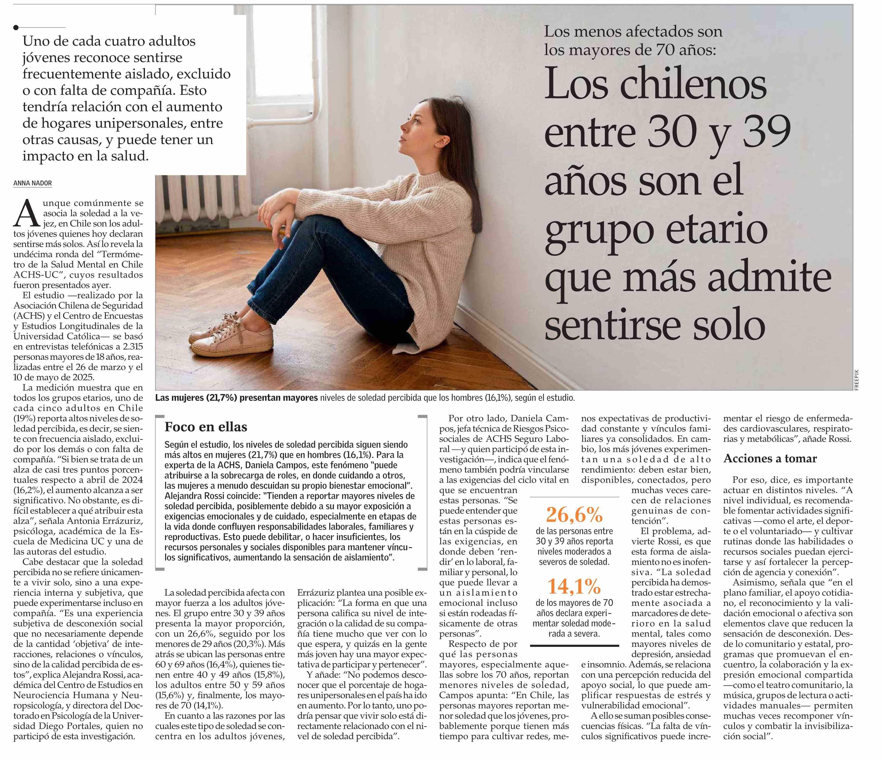 Los chilenos entre 30 y 39 años son el grupo etario que más admite sentirse solo 28-05-2025 El Mercurio |