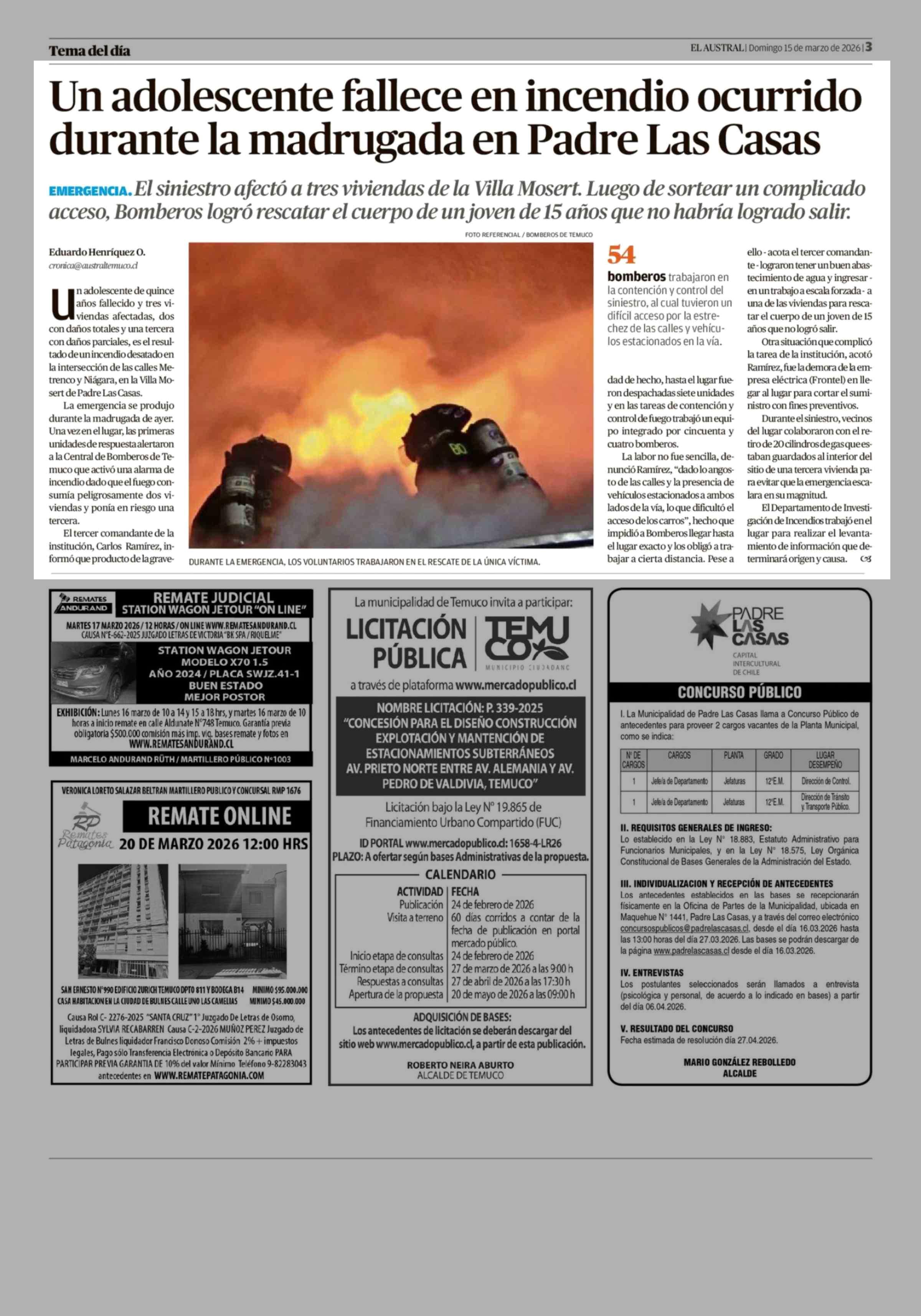 Un adolescente fallece en incendio ocurrido durante la madrugada en Padre Las Casas 15-03-2026 El Austral de la Araucanía |