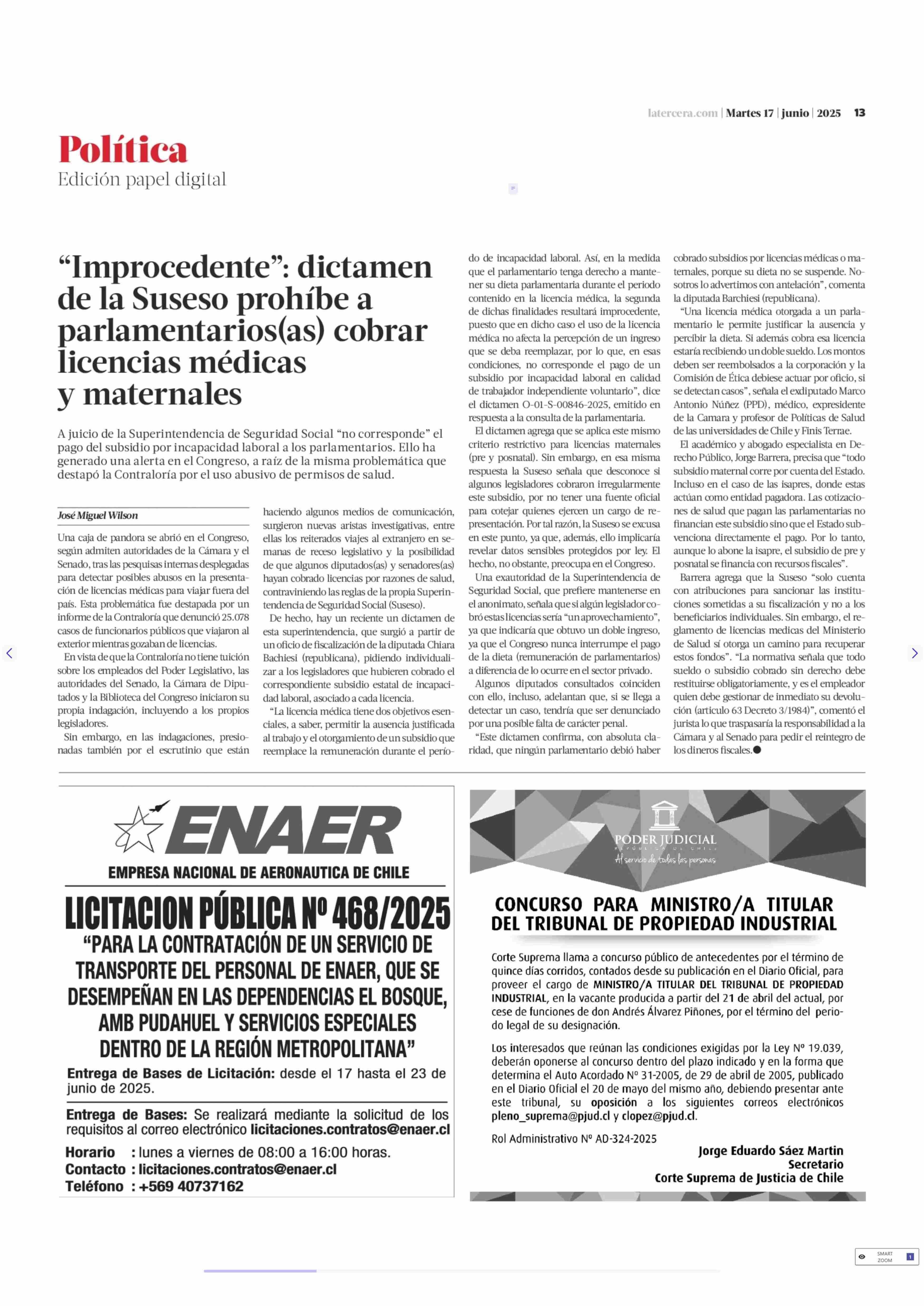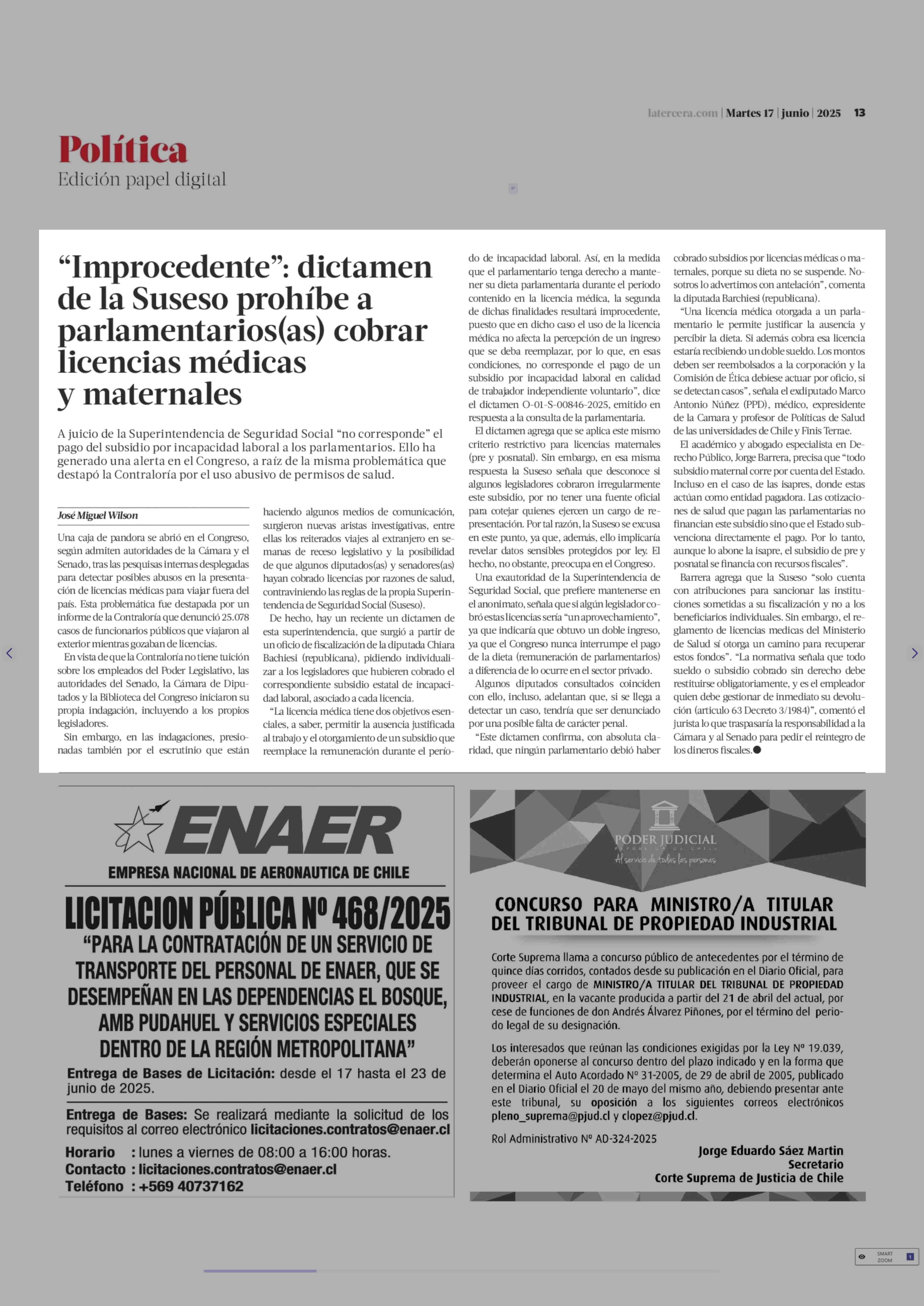 “Improcedente”: dictamen de la Suseso prohíbe a parlamentarios(as) cobrar licencias médicas y maternales 17-06-2025 La Tercera |