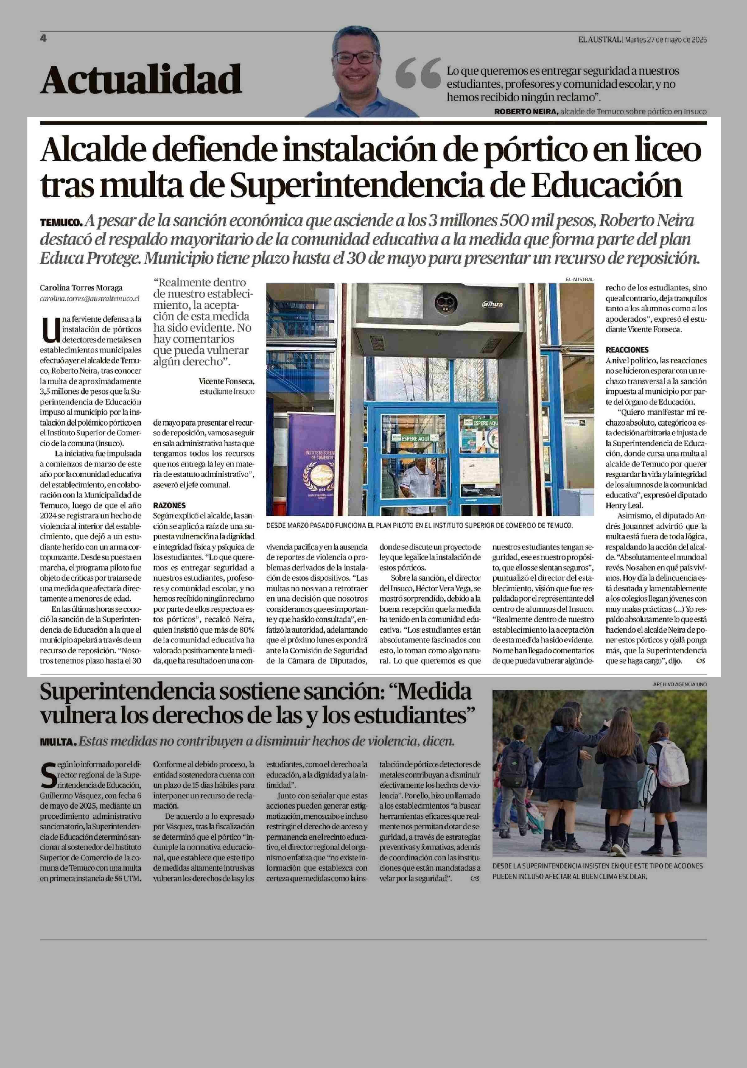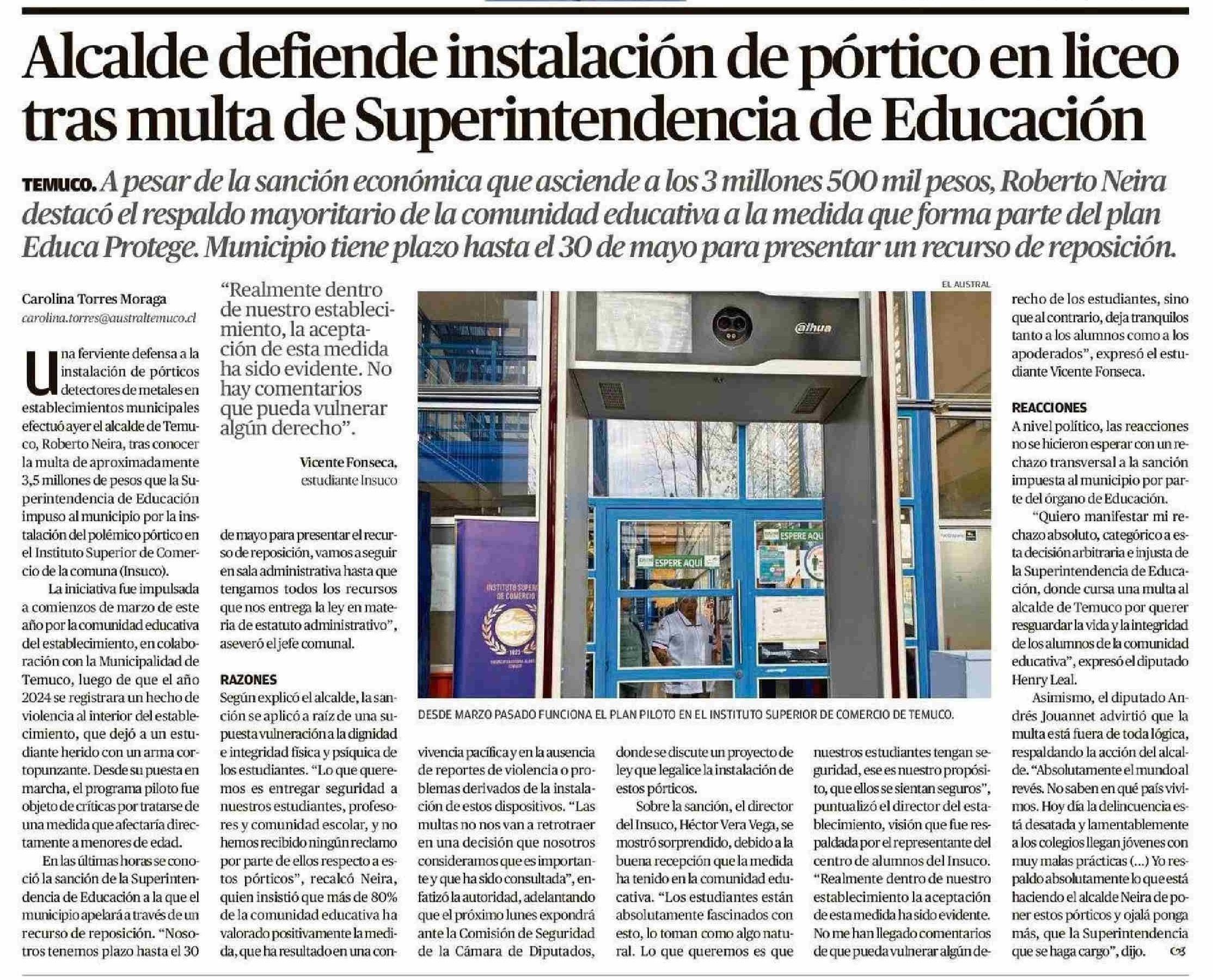 Título: Alcalde defiende instalación de pórtico en liceo tras multa de Superintendencia de Educación