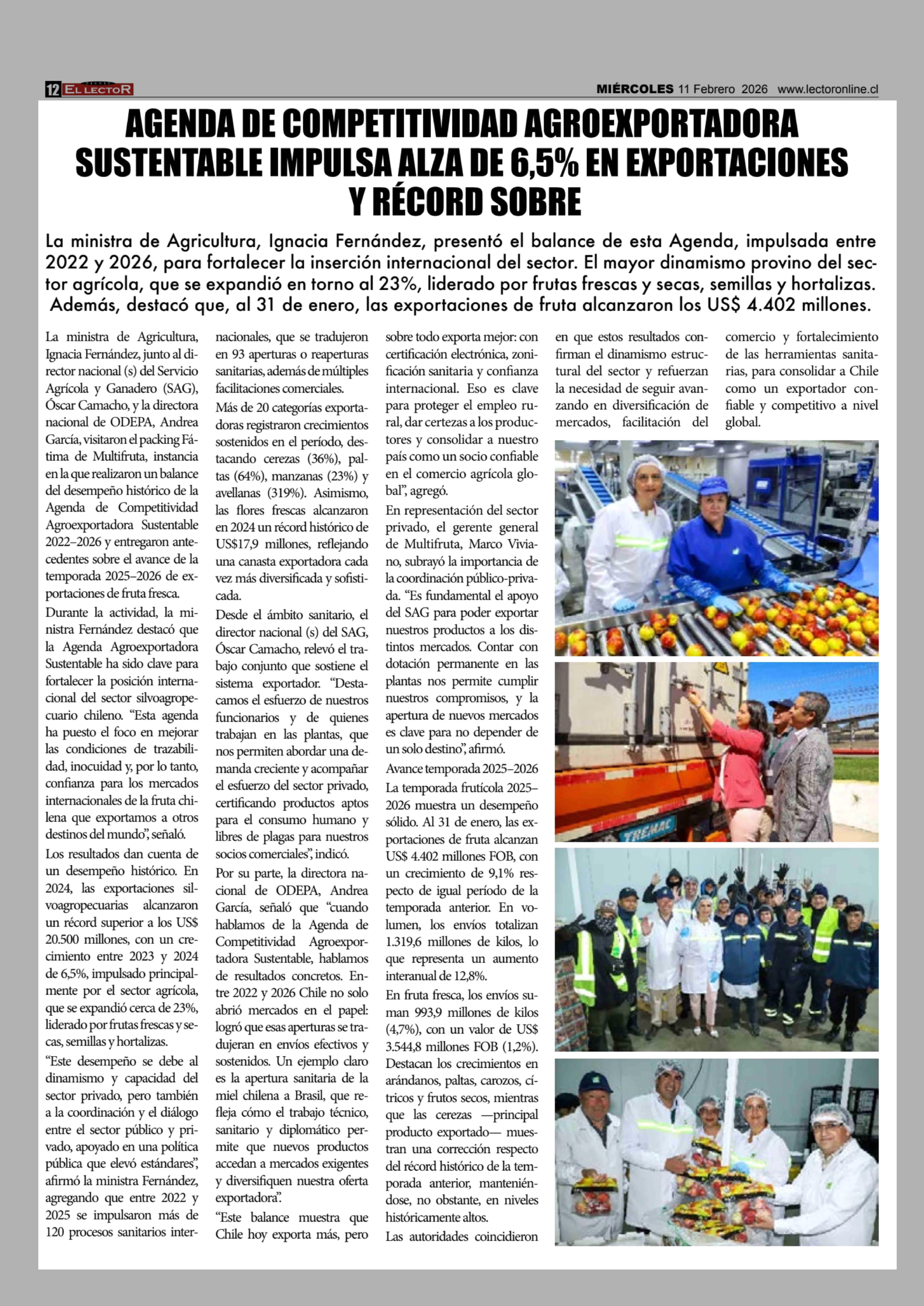 Título: AGENDA DE COMPETITIVIDAD AGROEXPORTADORA SUSTENTABLE IMPULSA ALZA DE 6,5% EN EXPORTACIONES Y RÉCORD SOBRE