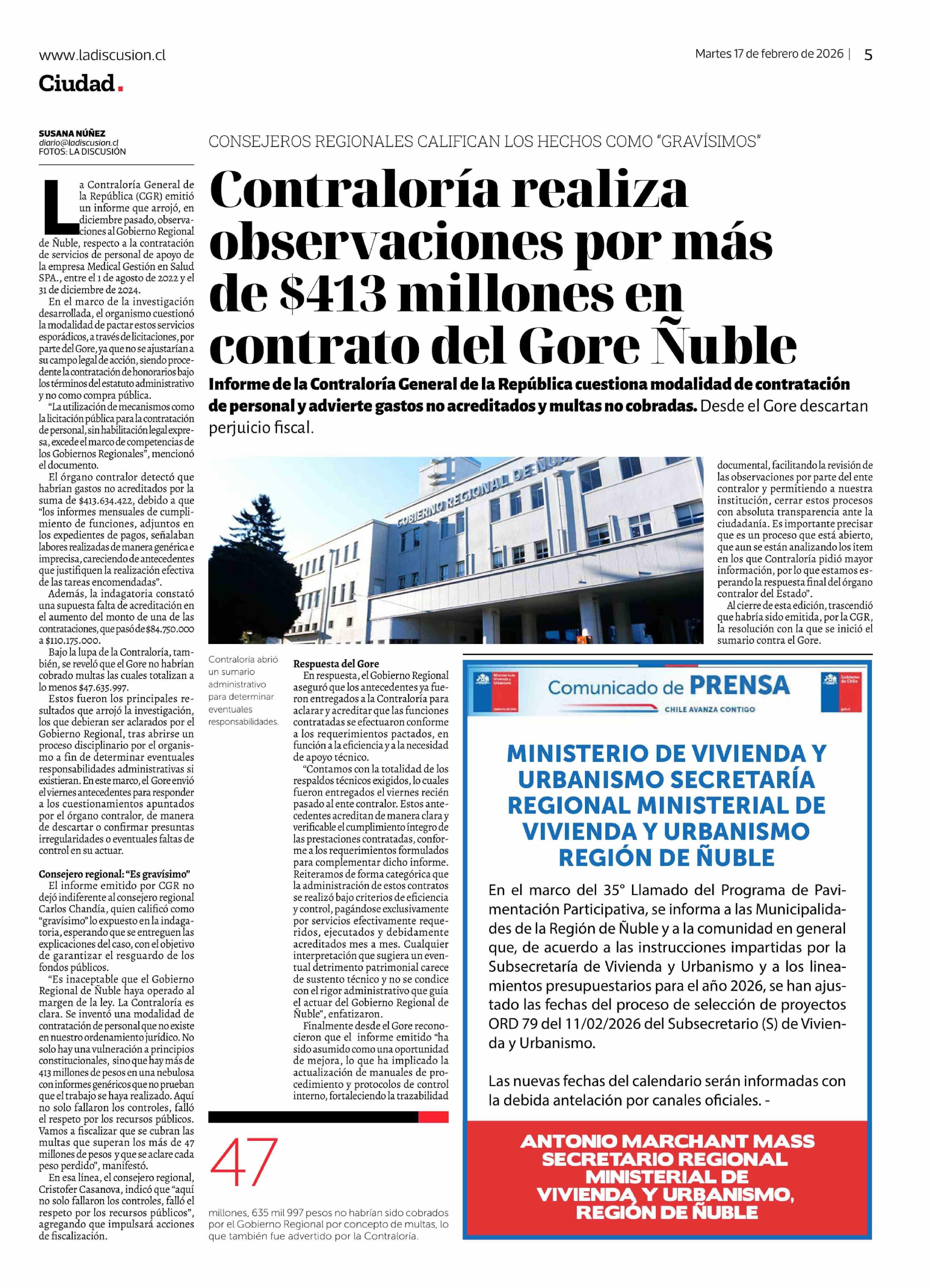 Extractos: MINISTERIO DE VIVIENDA Y URBANISMO SECRETARÍA REGIONAL MINISTERIAL DE VIVIENDA Y URBANISMO REGIÓN DE ÑUBLE 17-02-2026 La Discusión |