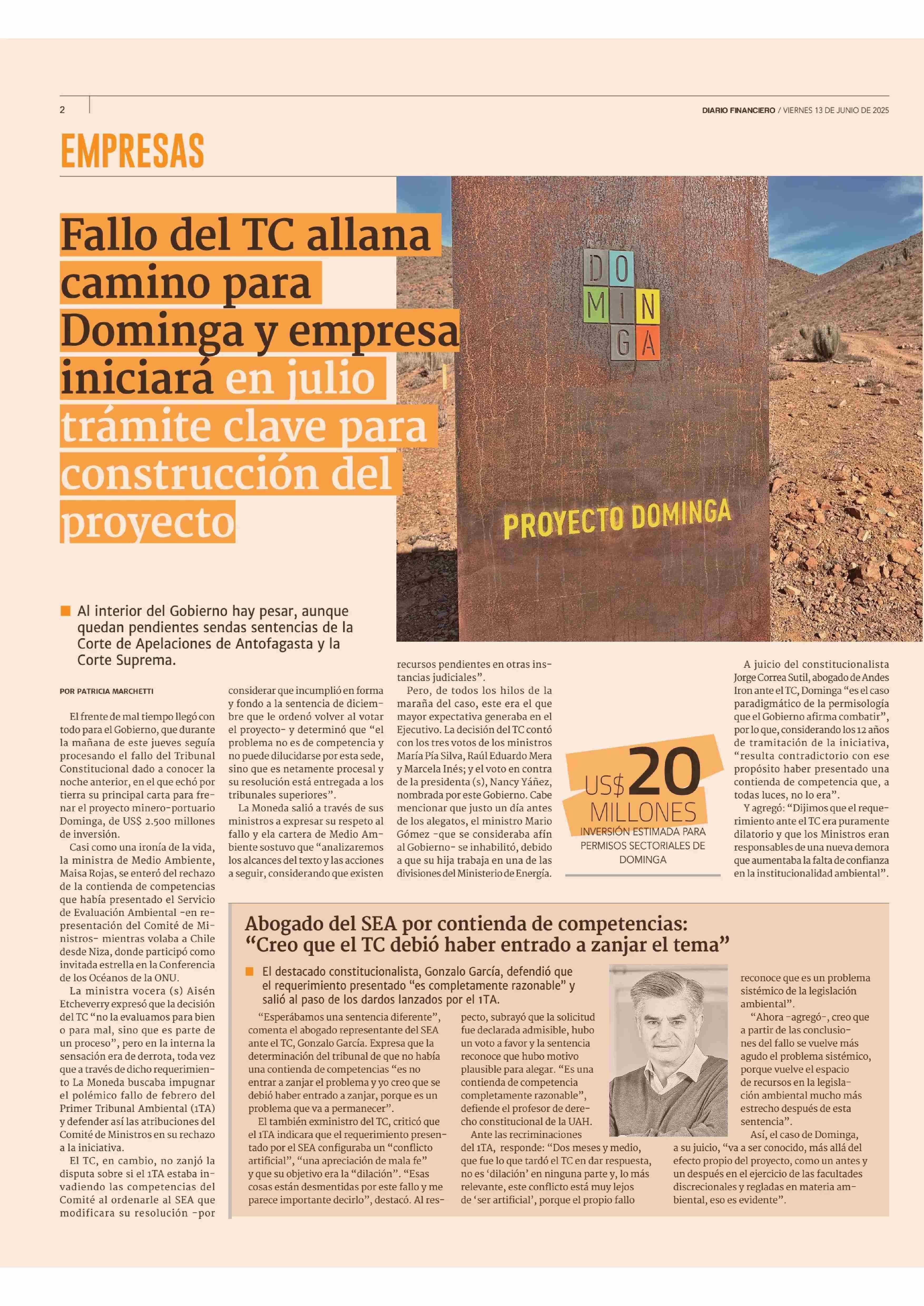 Fallo del TC allana el camino para Dominga y empresa iniciará en julio trámite clave para construcción del proyecto 13-06-2025 Diario Financiero |