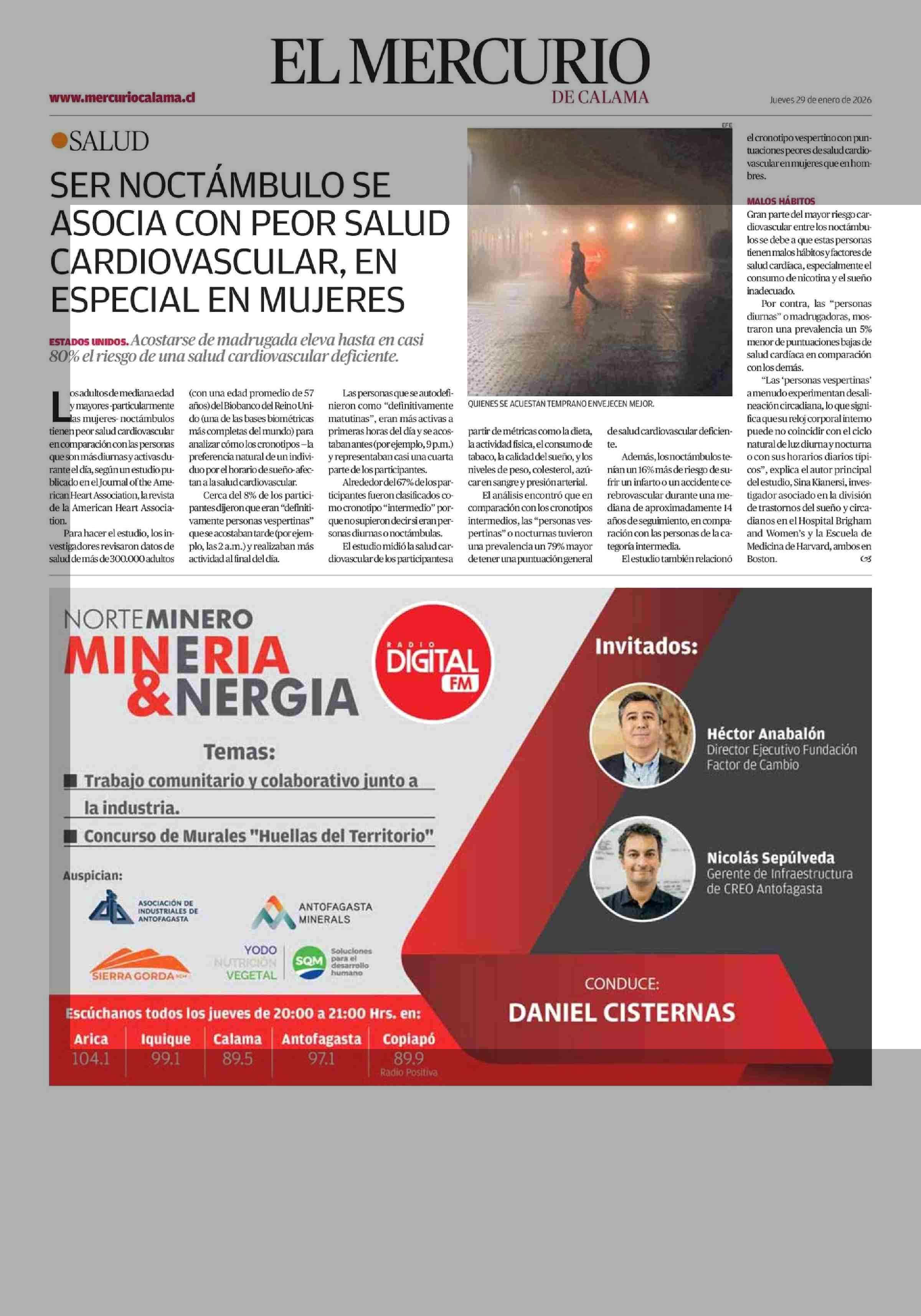 SER NOCTÁMBULO SE ASOCIA CON PEOR SALUD CARDIOVASCULAR, EN ESPECIAL EN MUJERES 29-01-2026 El Mercurio de Calama |