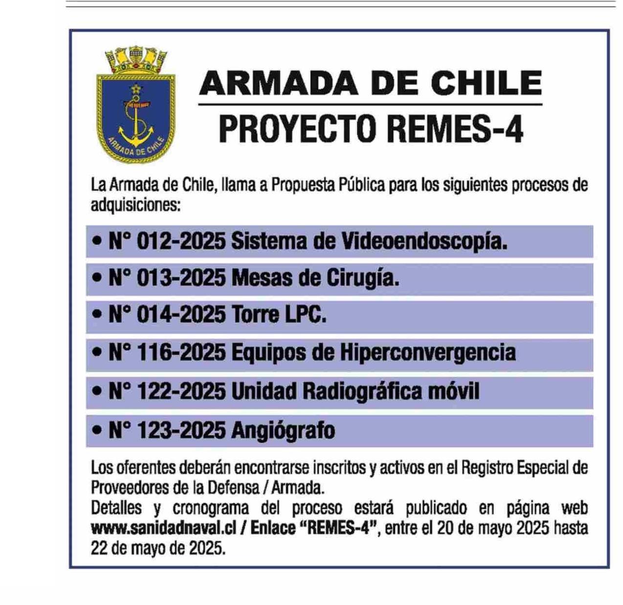AVISO LICITACIONES: ARMADA DE CHILE PROYECTO REMES-4 19-05-2025 Las Últimas Noticias |