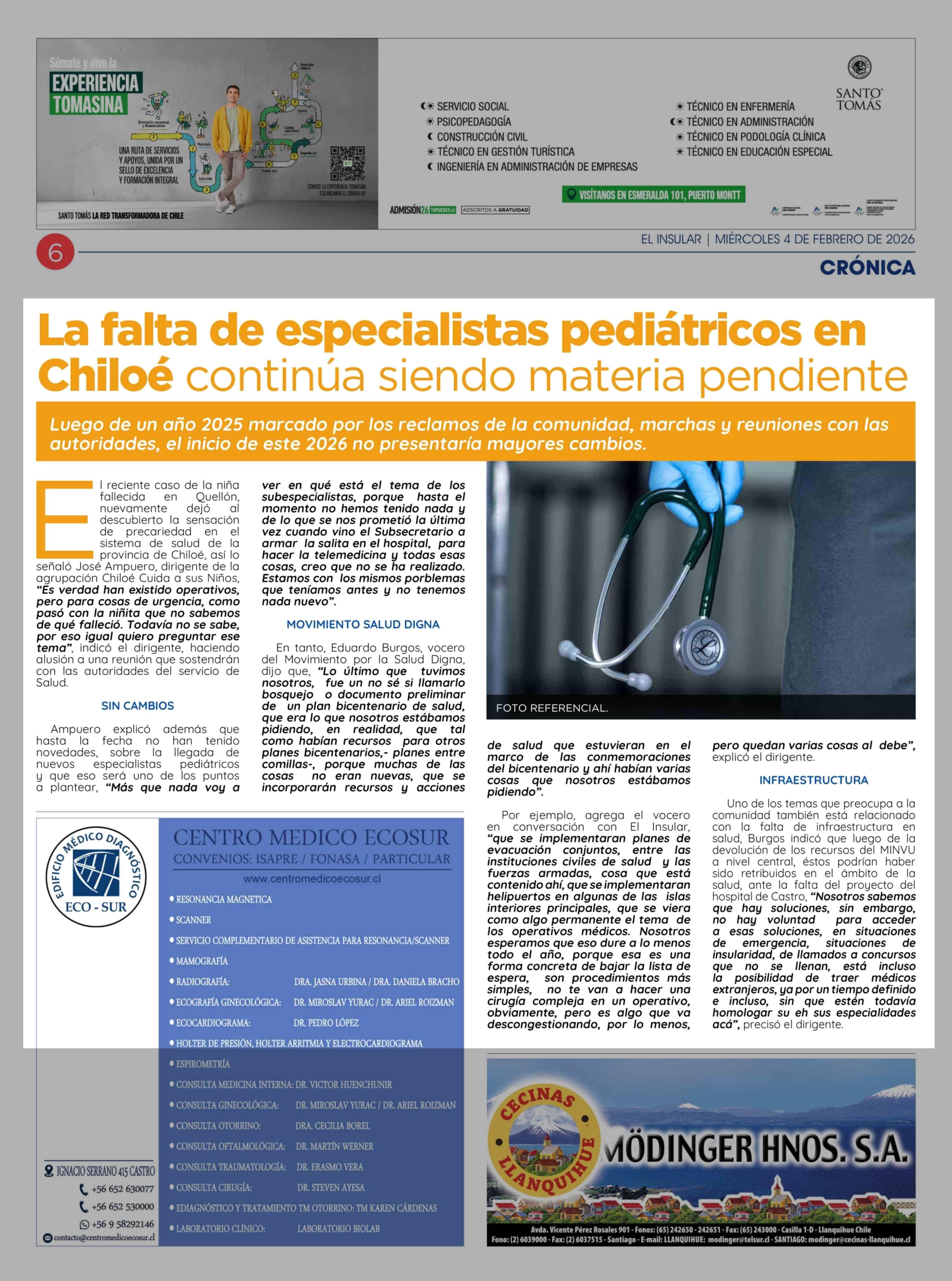 La falta de especialistas pediátricos en Chiloé continúa siendo materia pendiente 04-02-2026 El Insular |