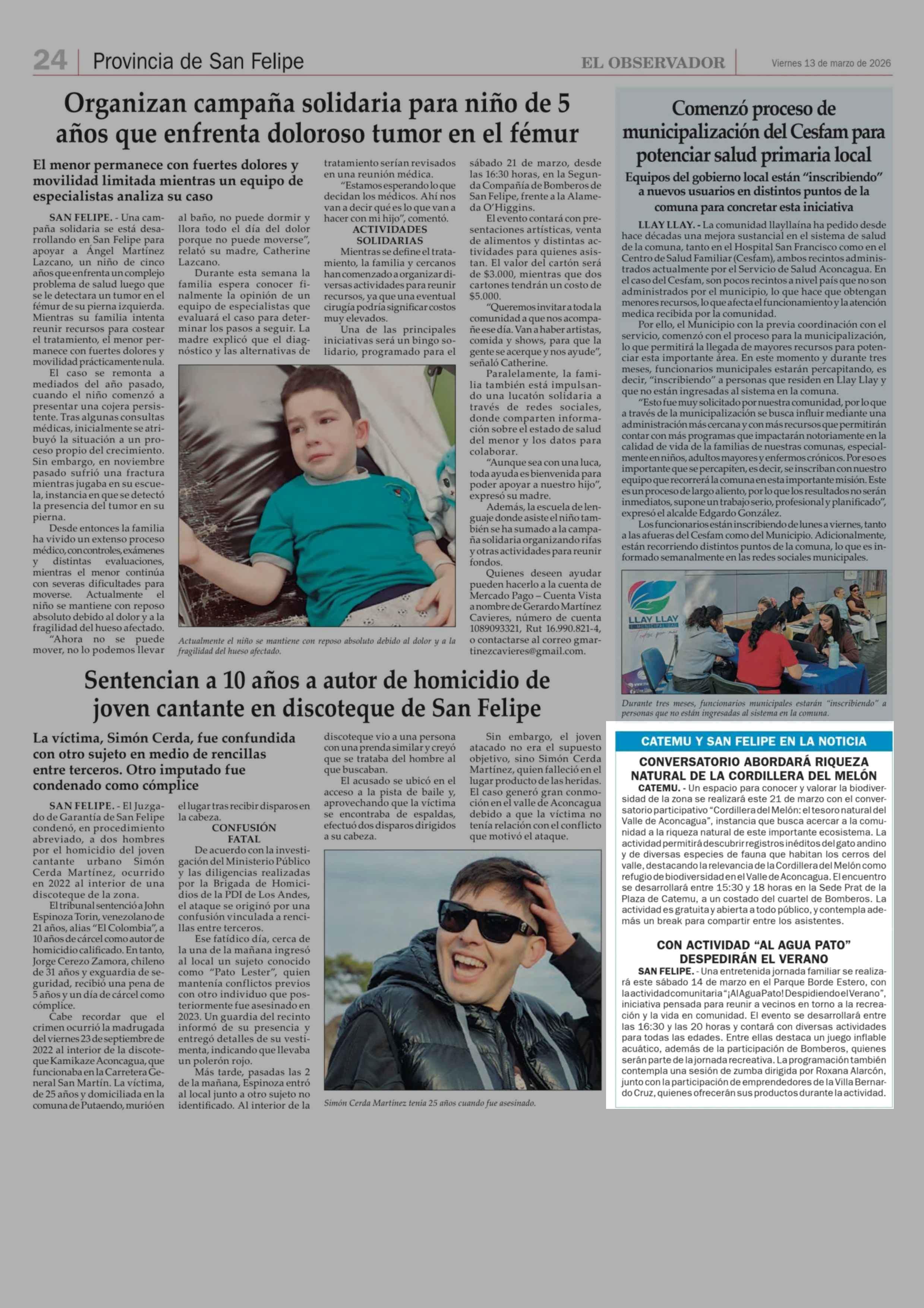 CATEMU Y SAN FELIPE EN LA NOTICIA 13-03-2026 El Observador |