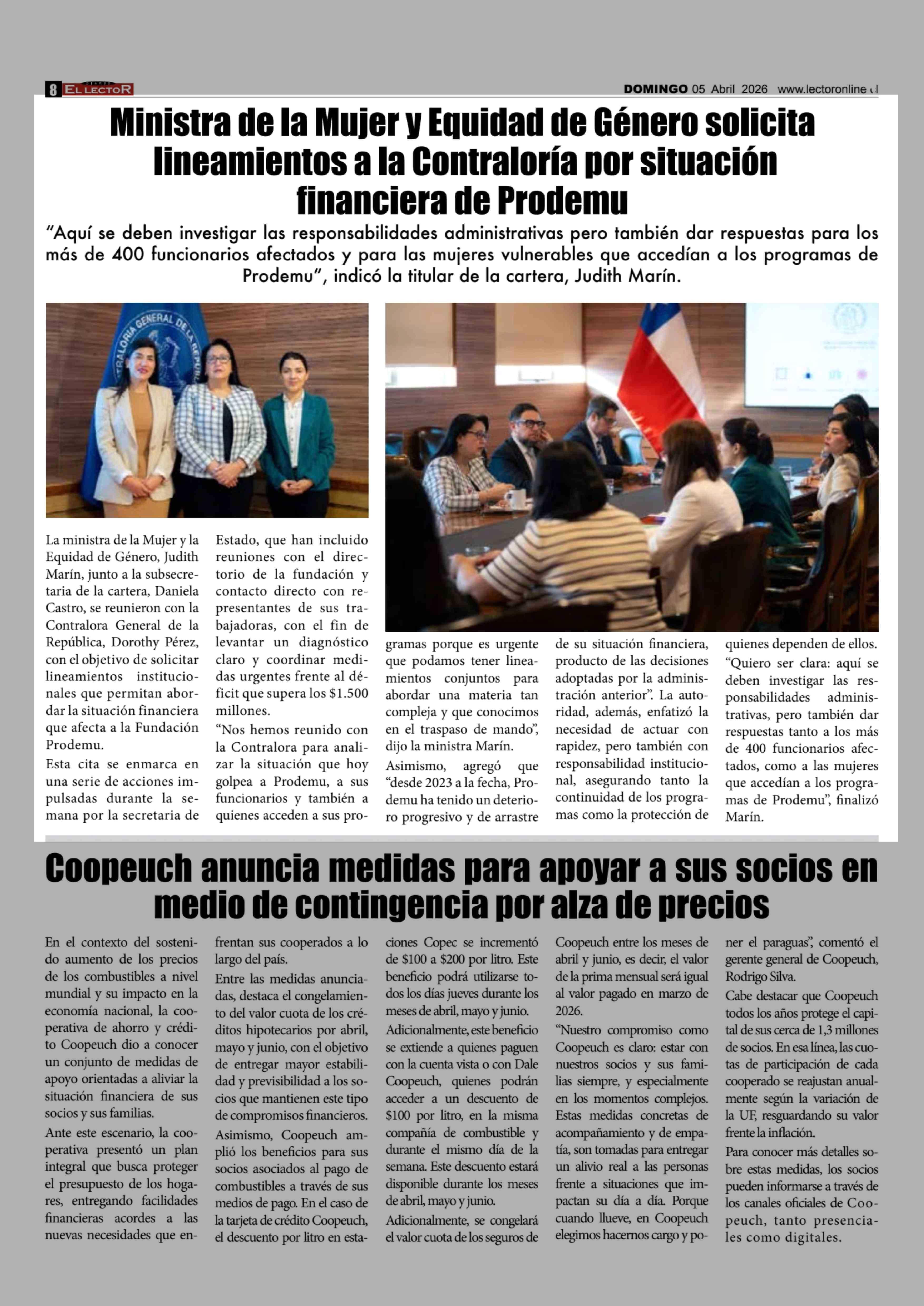 Ministra de la Mujer y Equidad de Género solicita lineamientos a la Contraloría por situación financiera de Prodemu 05-04-2026 El Lector |
