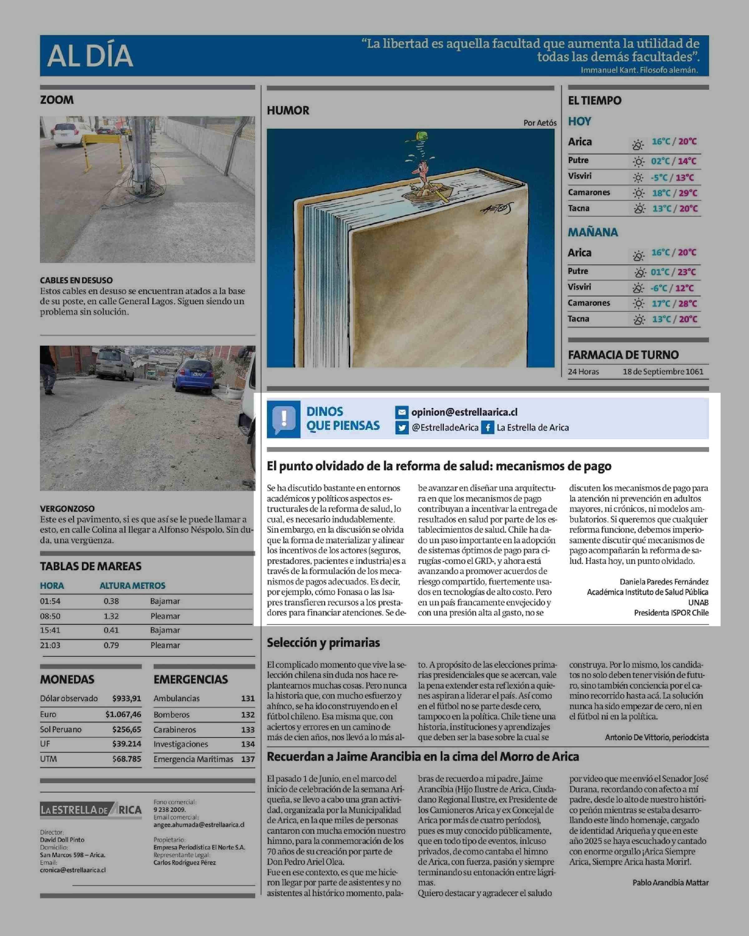 El punto olvidado de la reforma de salud: mecanismos de pago 10-06-2025 La Estrella de Arica |