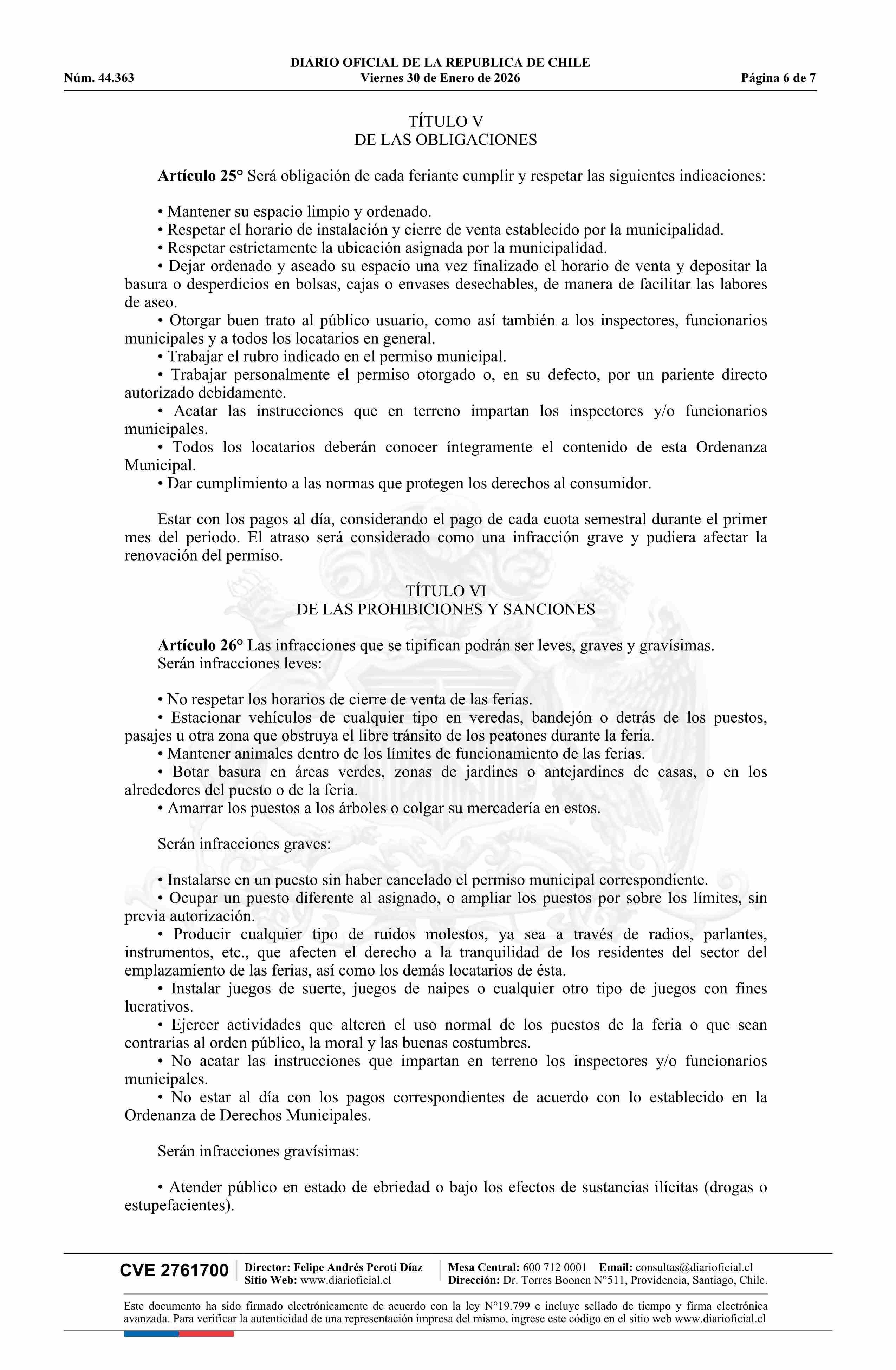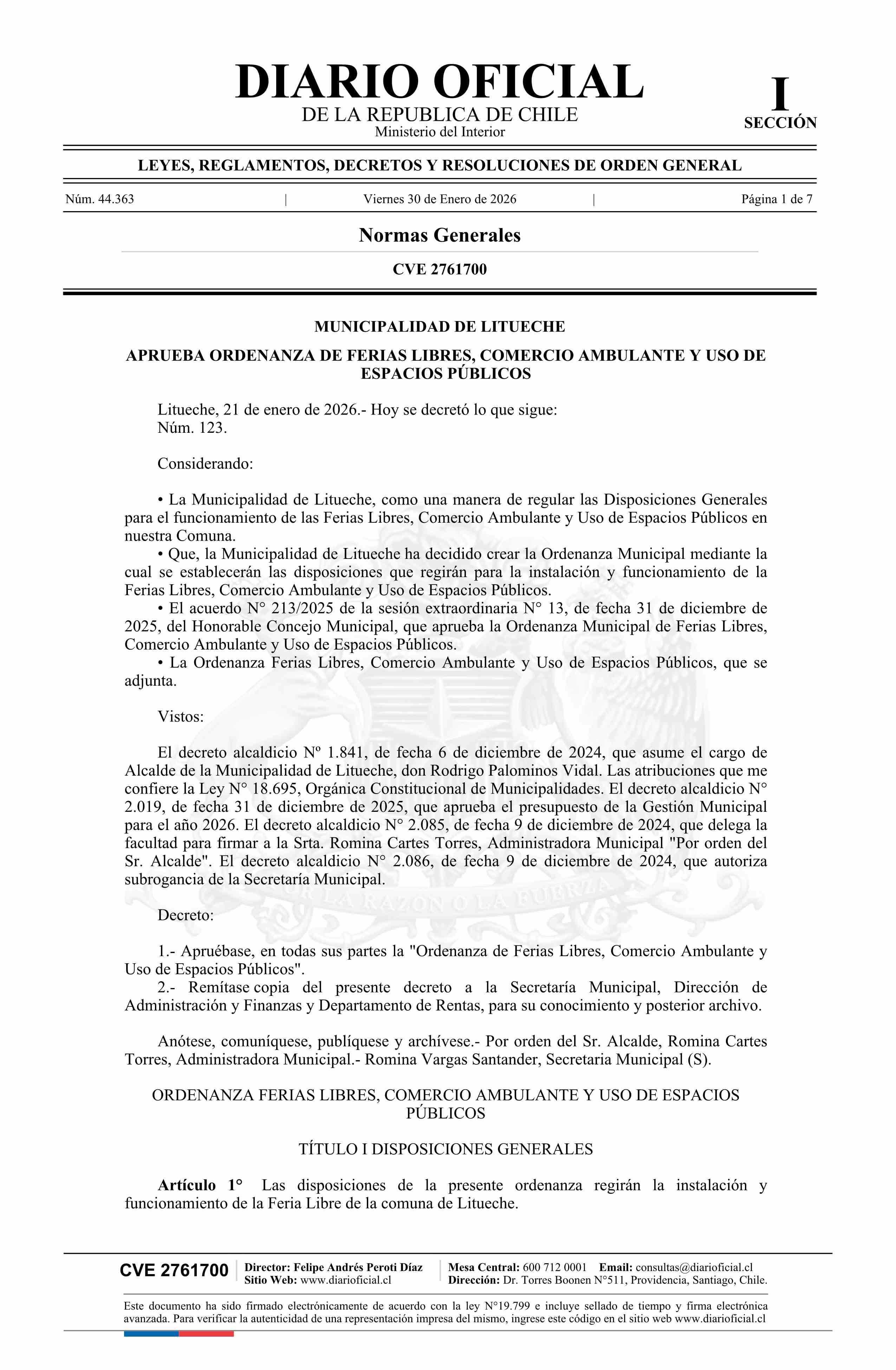 Decreto alcaldicio número 123, de 2026.- Aprueba Ordenanza de Ferias Libres, Comercio Ambulante y Uso de Espacios Públicos 30-01-2026 DIARIO OFICIAL CHILE - BOLETÍN OFICIAL DE MINERÍA |