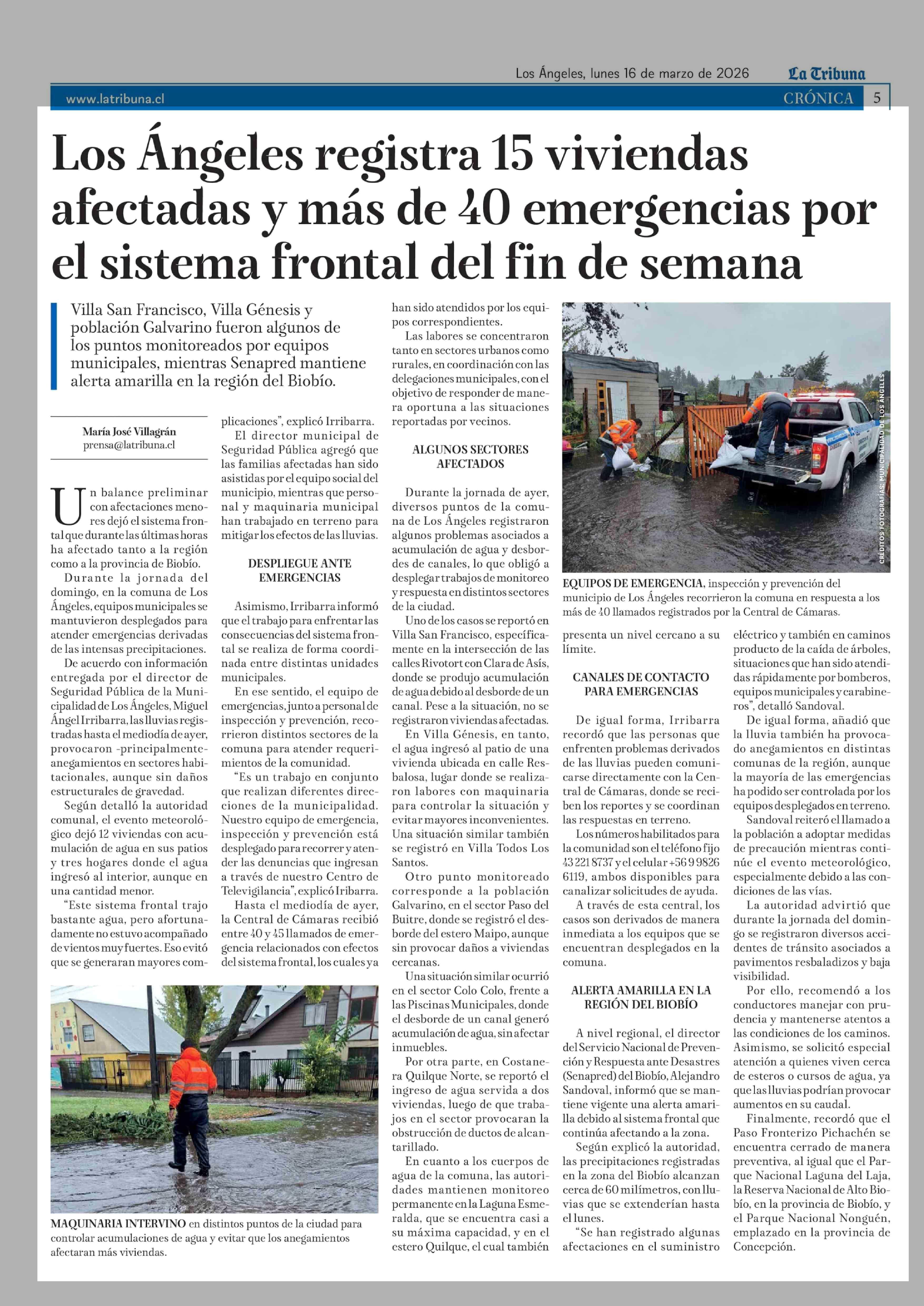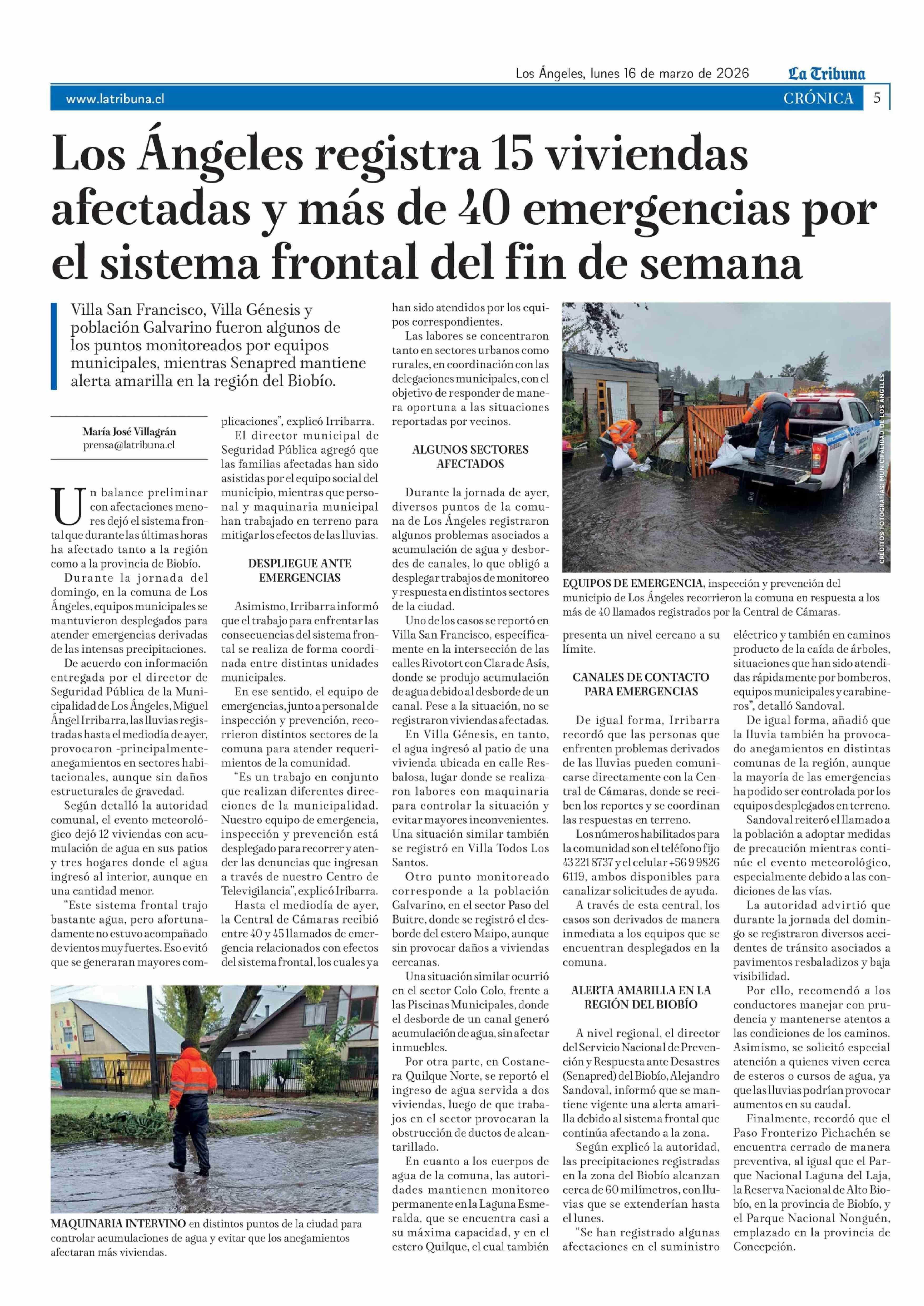 Los Ángeles registra 15 viviendas afectadas y más de 40 emergencias por el sistema frontal del fin de semana 16-03-2026 La Tribuna |