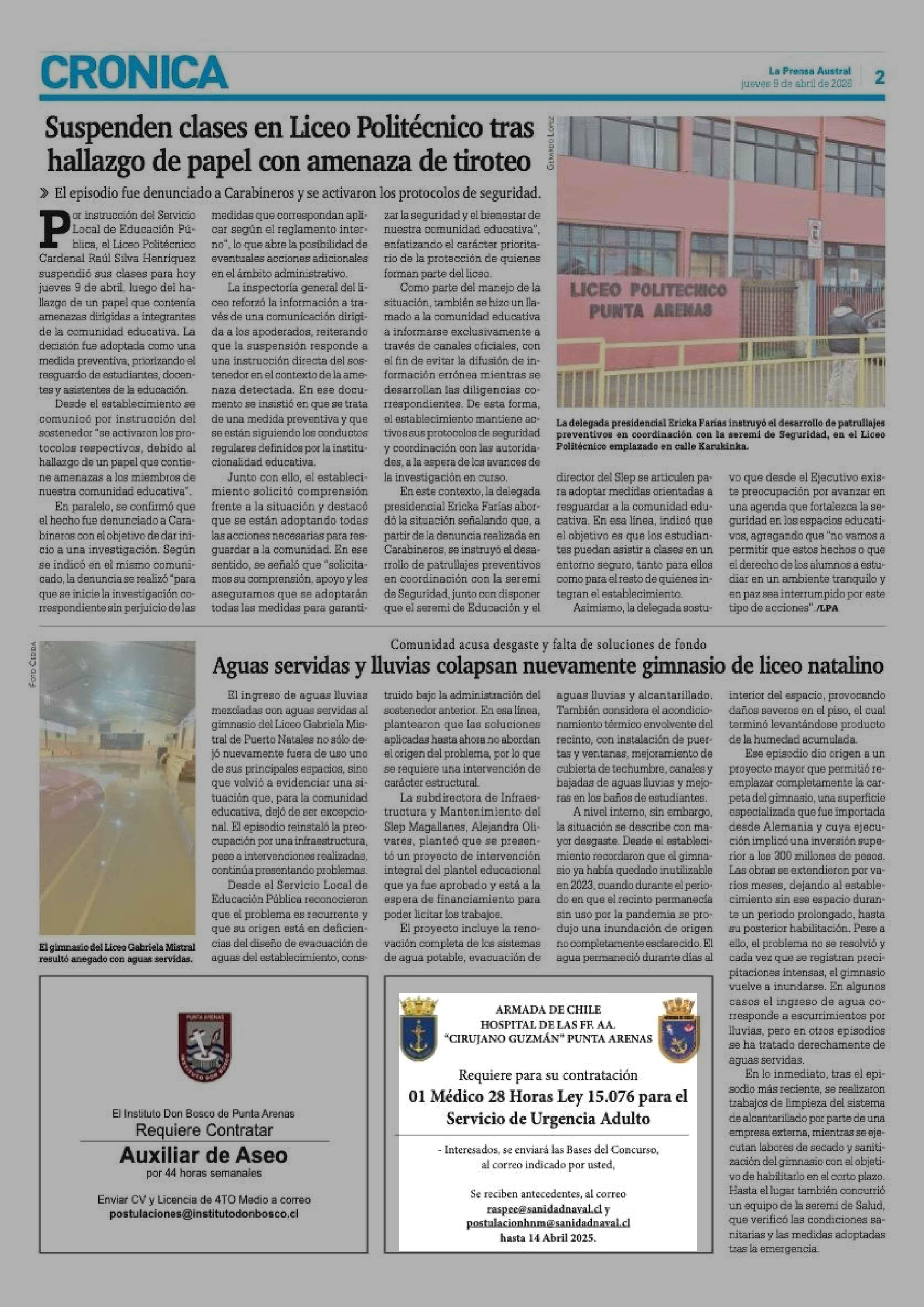 ARMADA DE CHILE HOSPITAL DE LAS FF. AA. "CIRUJANO GUZMÁN" PUNTA ARENAS 09-04-2026 La Prensa Austral |