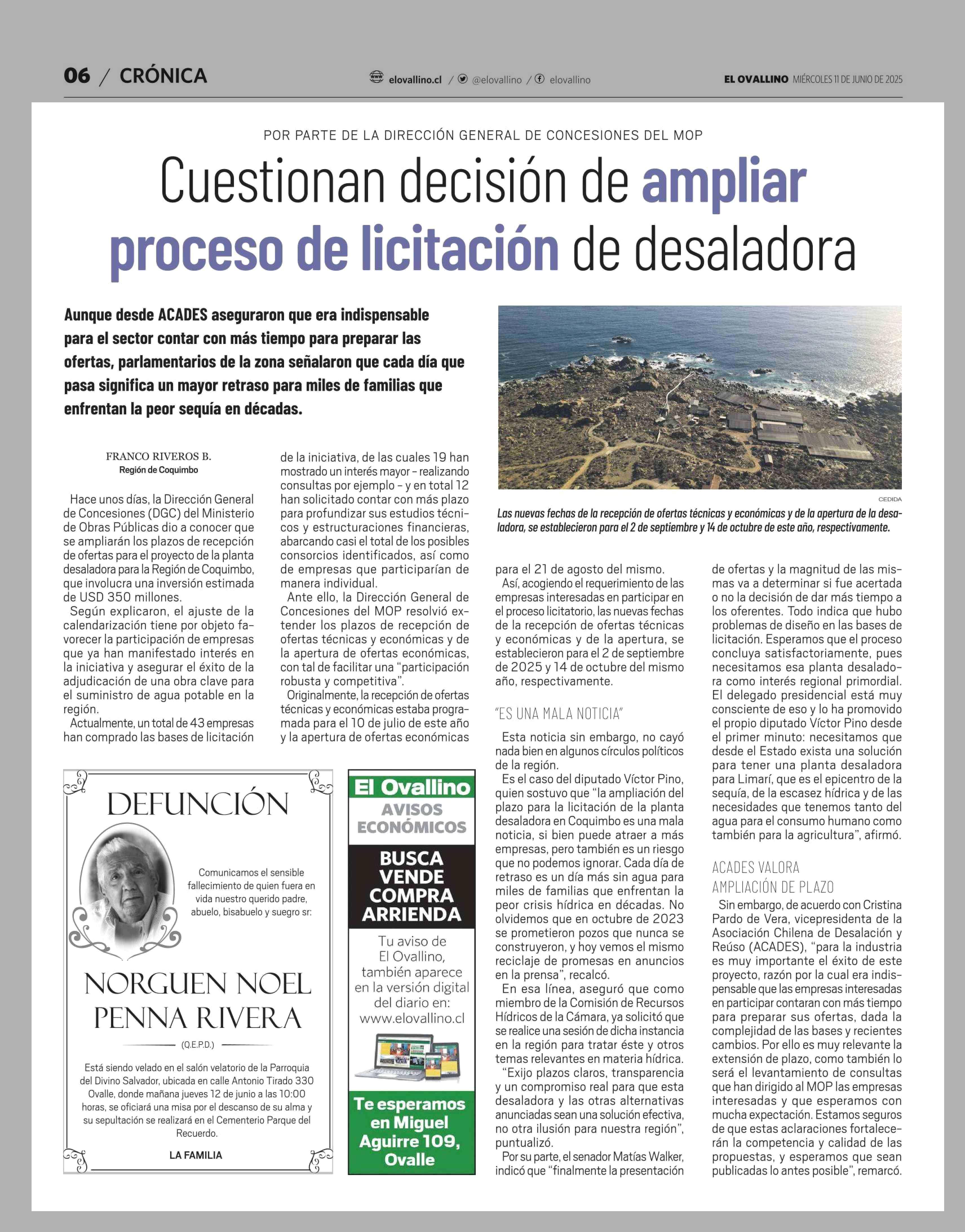 Cuestionan decisión de ampliar proceso de licitación de desaladora 11-06-2025 El Ovallino |